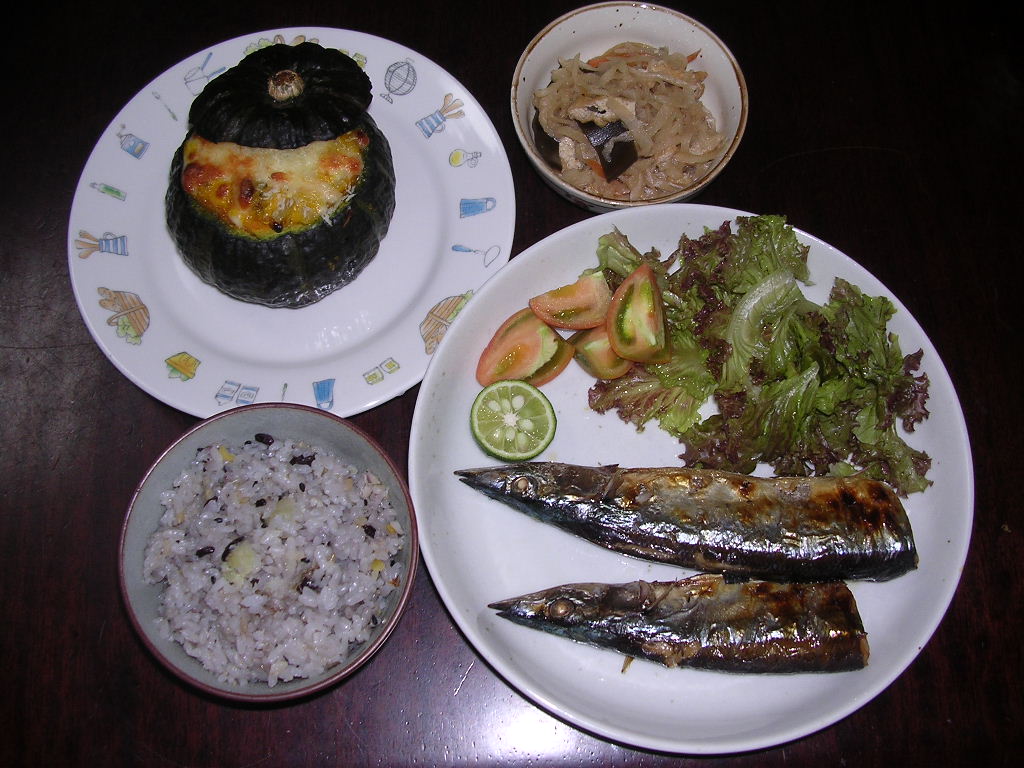 昨夜はさんまの塩焼きとぼっちやんかぼちゃのグラタン風・切干大根の煮物・10穀ご飯に発芽玄米とサツマイモの角切りを混ぜて炊いた、ごちゃまぜご飯です。