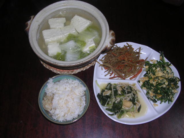 湯豆腐・金平ゴボウ・ニラ玉・ビタミン菜の煮びたし・発芽玄米ご飯です。写真は旦那の分です。