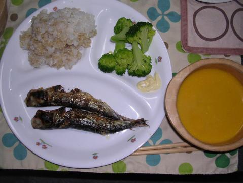 かぼちゃスープ・ブロッコリー・玄米入りご飯・いわしの一夜干しを焼いた物。