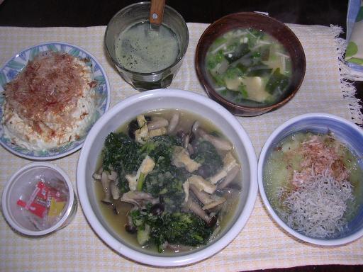 大味噌汁・根おろしのちりめんがけ・春菊とシメジの煮びたし・おぼろ豆腐・納豆・玄米酵素を水で溶いたもの。