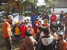 9時、自宅を息子の仲間の3年生の子(F君)の家により、あそあそ目ざして途中、「あっ、昆虫王国にいく道だ」とF君。で、あそあそへ到着。息子が夏のキャンプで世話になったロメもプレイ・リーダーだ。続々と、参加者が到着。やっぱり、小さい子が多いよな~と思いつつ、結局、総勢30人ほどにで、恒例のウエルカム・パーテイー。「寒い人は、いますか~」「ハーイ」「では、走りま~す」子どもたちは、早いのなんのって。まずは、か~るく、ウオーミングアップ。で、早速、あそあそ探検。皆で、大声で、ロメに負けないくらいに...「お~い」そして、雪の積もった山肌を、どんどん登ります。小さい子も、滑りながらも、めげずにどんどん上へ上へと。お父さん・お母さんのほうが、途中でストップ。結構キツイ勾配なので...滑って、降りるぞ~と、雪の下にふきのとう発見大きい子と、お母さんがたは、そっちのほうに夢中になっている。下におりて、雪合戦をしながら、水飲み場へ。夏は冷たくとキ~ンとするのに、冬は、かえって暖かく感じる。年間を通して、水温が変わらないからだろう。まさに、肌で感じる自然の営み。いざ、お昼の準備。雪下白菜の収穫雪の下で、じっくりと甘みと栄養が蓄えられている。を点けるのは、ジャンケンの結果、5歳の子に。初めて、マッチを使うのだとか。いざ火がつかないと、お昼のメインの豚汁が作れないのだ。しかし、無事、火がついた。屋外で、焚き木を焚きながら豚汁をつくり、屋外で食べること。あんまり、しないんだろうなあ。特に、この季節は。で、おかまにタップリの豚汁ができて、お昼。あつあつの豚汁と、持参のおにぎり。もう、それだけで、十分だ。食べたあとは、雪遊び+かくれんぼ+鬼ごっこ+雪合戦.....で、いつもの調子で、小さい女の子と大の仲良しになってしまった。(うちのおねえも、こんな頃があったんだよな~と思ってしまう)いっぱい遊んで、終了~。なんと、タクシーでこられた方がいらっしゃたのだ。帰りは、上市駅まで、送ってさしあげた。なんと、一番仲良くなった女の子とそのお母さんだった。息子とF君とバイバイまた、来てくださいね~。-------------------------------------不便は、たのしい。(特定非営利活動法人 ホールアース研究所)