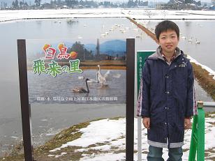昨年の冬から来ている白鳥を見に行った。自宅から3キロほどの田圃。3枚に水がはってあり、立て札もたっている。最初は乗り気でなかった息子も、いざ実物を見ると興味深く見ていた。丁度、朝、所さんの目がテンで白鳥を取り上げていたので、グッドタイミングだ。実際に目にすると、やはり思っていた以上に大きい。それと、首がやたら長いのだ。勘定してみると、約55羽。いろんなやつがいるようだ。まだ、寝ぼけているようなのもいれば、じっと周囲をみているもの。つがいかと思われるものや、背伸び(?)をしているもの。やっぱり、実物が一番だ。これからも、毎年きてほしいものだとこころから思う。