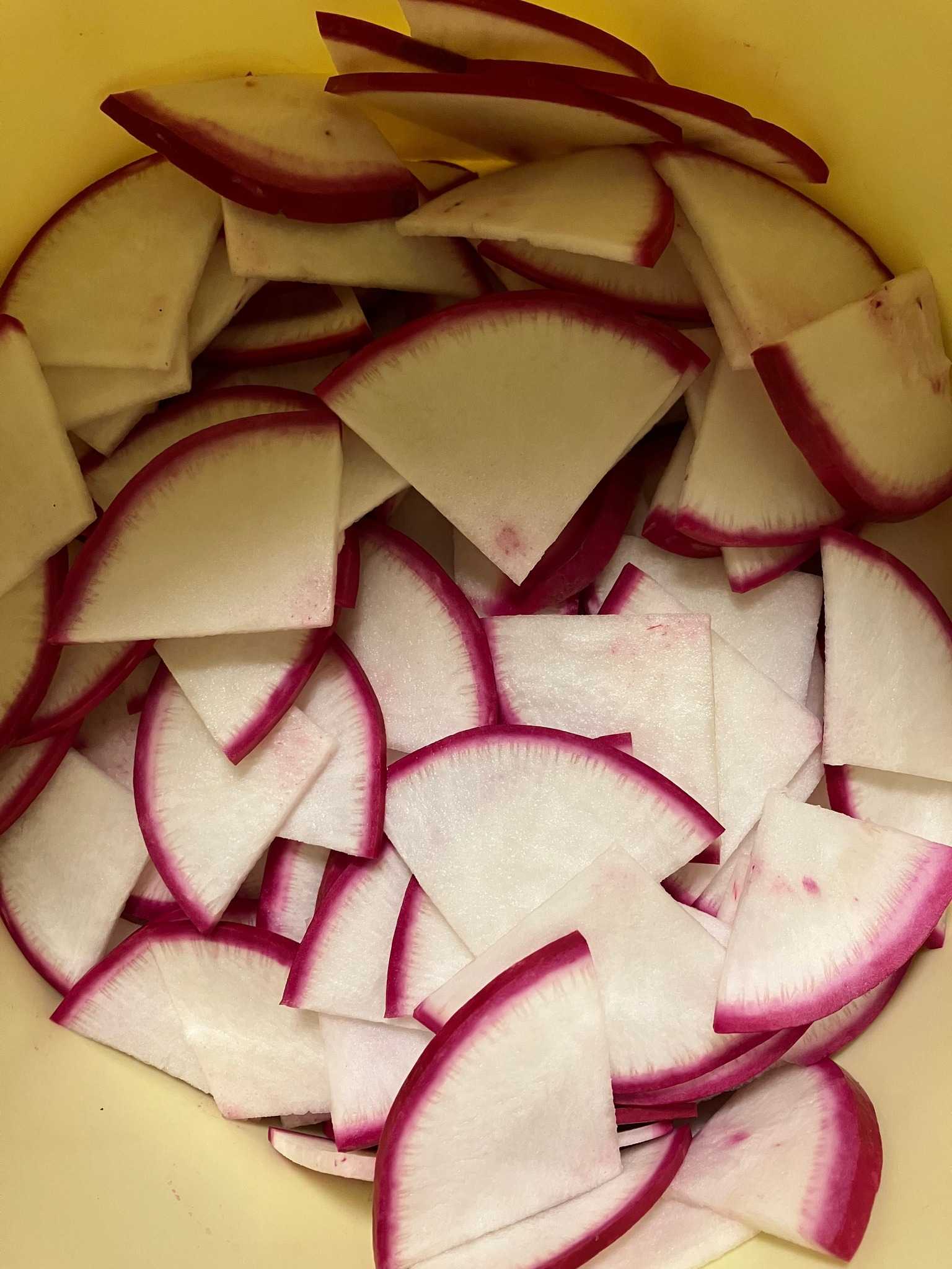 仕事を終え帰宅。やろうと決めていた赤蕪の漬けこみ。水洗いして、4等分にして、スライサーを使って。手慣れたもの。