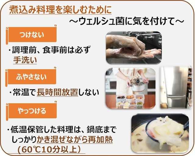 <食品安全対策>うっかりしがちな食中毒菌⇒「ウエルシュ菌」対策をどうぞ! カテゴリ:★食品安全の啓発活動★食品安全皆さま こんにちわ。筆者(末次賢治/慈善活動部)は、年来、食品安全啓発委員であります。これは、国の内閣府の組織となりまして、就任以来、食品安全推進の活動を展開しております~~~~~~~~~~~~~~~~~~~~~さて、書きご覧下さいまし。農水省と食品安全委員会からのお知らせをそのまま、皆様にも共有致します~~~~~~~~~~~~~~~~~~~~~~~~~~~~~~~~~農林水産省 maff 【煮込み料理を楽しむために~ウェルシュ菌に気を付けて~】最近は涼しい日が続き、秋の訪れを感じますね。秋には季節の食材を使った煮付けやカレー、シチューなどの煮込み料理もお勧めです。煮込み料理は、大きなお鍋で多めに作って何日かに分けて食べると、2日目は具材が馴染んで更に美味しくなるからと、続けて食べるご家庭も多いのではないでしょうか。★しかし、煮込み料理を調理する際に、気をつけたいのがウェルシュ菌による食中毒です。食中毒の原因となるウェルシュ菌は、100℃で1時間の加熱にも耐える熱に強い「芽胞」注を作り、広範囲の温度域(12~50℃・至適温度:43~45℃)で増殖し、大鍋・大釜の中心部のような空気の少ないところでも容易に増殖することができる嫌気性細菌です。★ウェルシュ菌は耐熱性芽胞も持ち合わせていることから、加熱するから大丈夫と考えて、加熱と「常温での放置」を繰り返すことは非常に危険で、加熱した後の保存・冷却にも十分注意して下さい。 秋の煮込み料理を美味しくいただくための、ポイントは、次の通りです。・調理の際や食事の前には必ず手を洗いましょう。・調理したあとは、できるだけ早く食べましょう。・大量に作った料理を、常温のまま長時間放置しないようにしましょう。・保存する場合は、短い時間で出来るだけ温度が下がるよう、底の浅い容器等に一度に食べられる量を小分けして、冷蔵庫(10℃以下)で保存しましょう。・保存した料理を食べる際には、鍋底までしっかりかきまぜながら中心部まで十分に 再加熱(60℃10分以上)にしましょう。・保温する際には、ウェルシュ菌が増殖できない55℃以上に保ちましょう。注芽胞:ウェルシュ菌などの特定の菌が作る細胞構造の一種。生育環境が増殖に適さなくなると菌体内に形成する。加熱や乾燥などの過酷な条件に対して強い抵抗性を持ち、発育に適した環境になると、栄養細胞となり再び増殖する。#煮込み料理 #ウェルシュ菌 #食中毒詳細はこちらウェルシュ菌(細菌)[Clostridium perfringens](農林水産省)https://www.maff.go.jp/.../clostridium.perfringens.htmlファクトシート「ウエルシュ菌食中毒」(食品安全委員会) https://www.fsc.go.jp/.../factsheets...