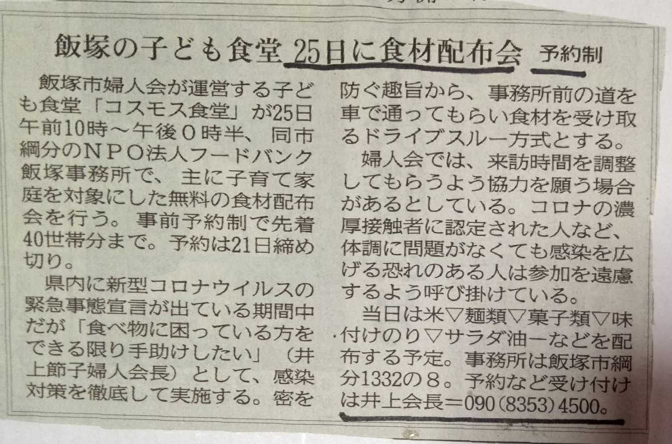 飯塚市婦人会の子ども食堂・食材配布会御利用者の皆さま、お早う御座います 添付ファイルをご覧下さいませ。917今朝の西日本新聞の朝刊記事・筑豊版です この記事の通りです 9/25日(土曜日)の 子ども食堂ですが、本来は、筑穂町交流センターにて、実施する予定でしたが、あいにく緊急事態宣言下のため、予定や予約方式を今回限り、すっかり変えまして、 (すっかり変更したのは、 感染予防対策措置の為です/やむを得ずご承知くださいまし) この添付の記事の通りになりました。先着です。ご関心があれば、どうぞ、婦人会会長の井上さん(090-8535-4500)に、直接お申し込みくださいまし。 お手数おかけしまして、すみませんが、どうぞ、宜しくお取り計らい下さいませ。作成者:末次通訳事務所・ボランティア事業部:末次賢治拝