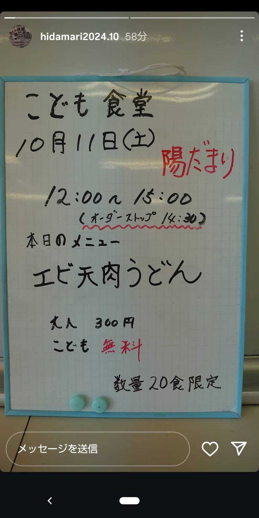 ◎ご紹介:陽だまり子ども食堂さまの10/11(土)のメニューと今後のご案内閲覧者の皆さまこんにちわ。慈善事業活動部/末次通訳事務所です昨日・10月11日 土曜日に実施された、【ひだまり子ども食堂】のメニューのご紹介(参考までに)と 今後のご案内です次回は、10月の第4土曜日つまり 10月25日になると思いますまたご案内いたします。上記子ども食堂を主催なされている、【陽だまり子ども食堂】様の インスタグラムをフォローされたら良いですよhttps://www.instagram.com/hidamari2024.10/?hl=ja上記の通りです。ご参照下さいませ慈善事業活動部/末次通訳事務所:末次賢治拝10/12 2025上記は今年度の実施周期のご案内です ご参照下さいませ: