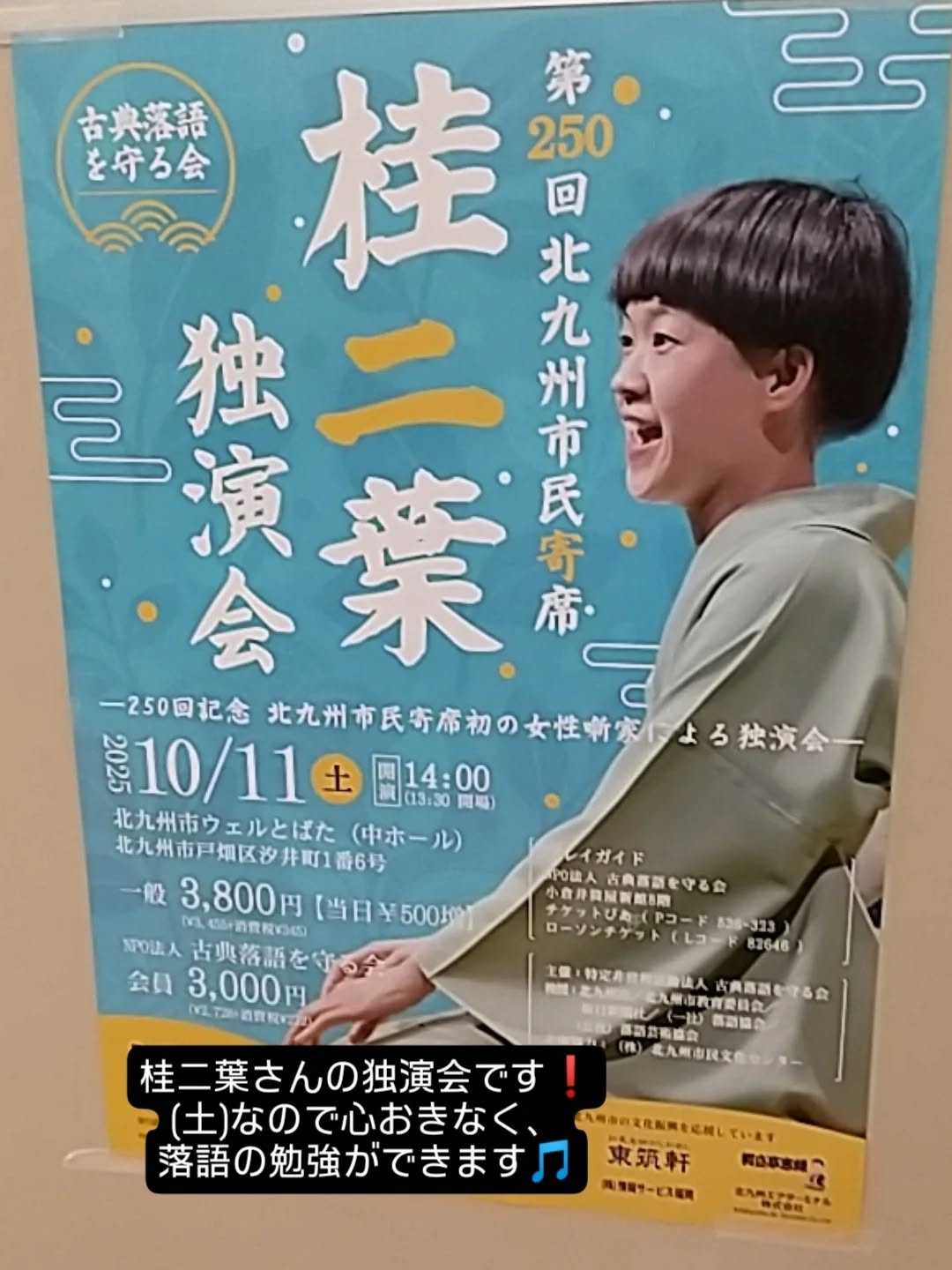 2025年10/11土曜日 ➡10月11日桂二葉独演会 於:戸畑この日は、北九州市の戸畑にて、上方噺家の桂二葉さんの独演会が戸畑駅近くの市民会館で有りましたので落語を聴くのは良い日本語学習ですから、稽古として、二葉さんの噺3席を聴きました。①看板のピン②豆狸まめだ③打飼盗人 の3席です。二葉さんは、売れっ子噺家で、毎日、何処かで高座に上がっていますので、さすがに、前よりも更に上手くなっています。我が身に振り返りますと、通訳機会が差程増えていませんから、とても怖いです。力の低下がですね。何とか対策を講じて前進して行かねばなりませんです。末次通訳事務所拝10月11日2025年