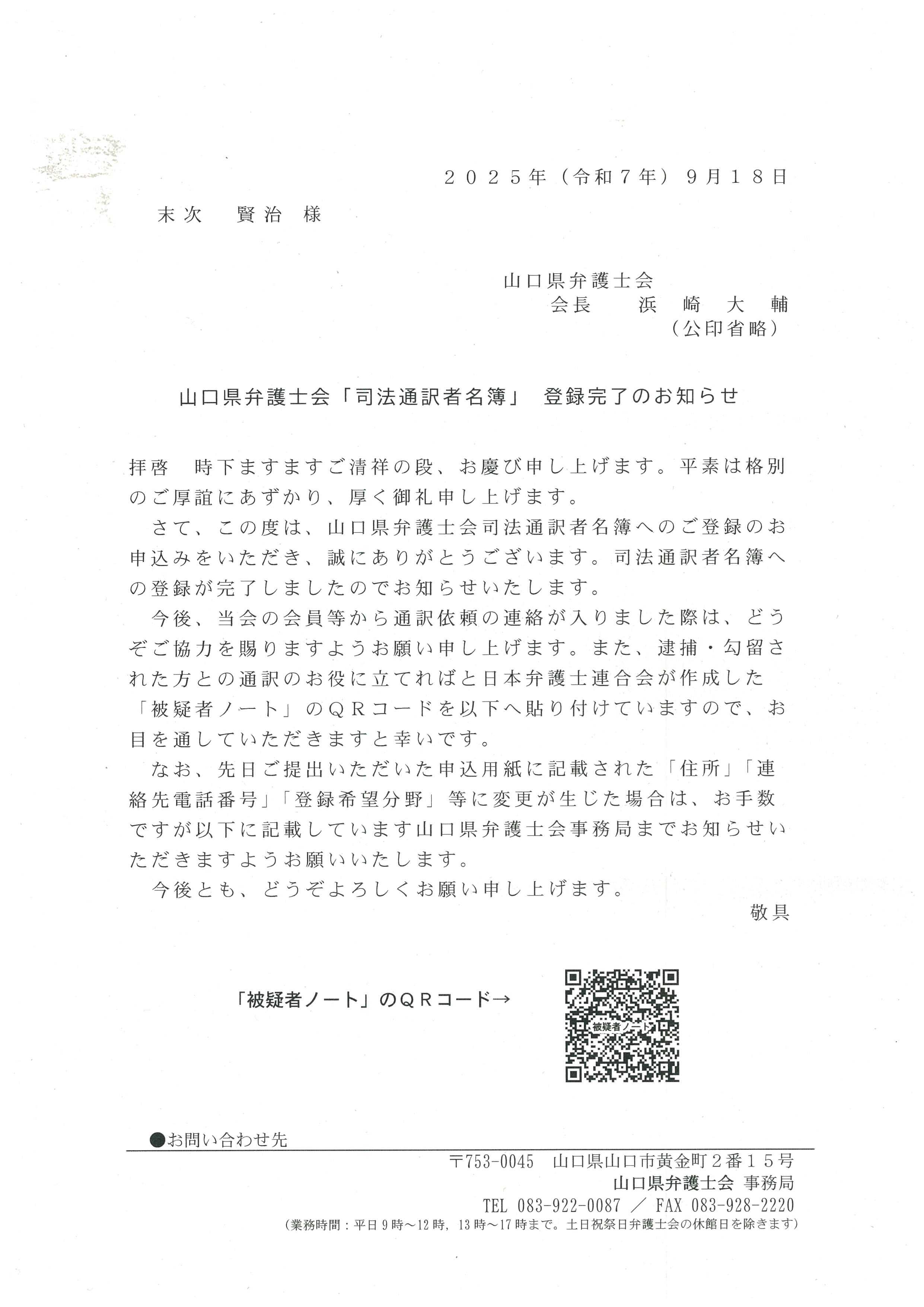>9月の報告(再掲)➡09月18日付書面:司法通訳者登録をして戴きました! 於:山口県にて皆さま、こんにちわ。お知らせです:下記ご案内申し上げます// 2025年10/06記 AA)小職・末次賢治は、此の度、【山口県弁護士会】様により、司法通訳者として、登録が認められました。実際に、過去に複数回、裁判所(家庭裁判所)やその他、警察機関での現場にて通訳業務を担当した事が認めらえたと思っております。この分野に、改めて、謙虚に進んで参りたいですね。BB)小職は、特にこの6年間、福岡県下の様々な病院や歯科医院他の医療機関にて英語通訳業務を展開しております。医療通訳業務では、小職が通訳で担当する患者様も毎回の度に回復を見せ、また、医療側と患者様側の両方で感謝をされることがよくありまして、とても強い遣り甲斐を感じております。この様な場面での通訳業務が自分には適していると痛感しております。また司法場面の通訳業務は複数回経験しておりまして、今後、此の分野にも積極的に英語通訳者として業務展開をしていきたい思う所存です。~~CC>昨今は、いわゆるインバウンド増加により、観光名所などでのガイド通訳者の需要が増えておりますが、小職は、こうした貝と通訳には関心がありません。>それは、自分自身がロンドンに、あるいは、その他の新規の土地に参ります際には、自分はガイドなどは不要で、自分の能力をすべて傾けて、その土地土地の開拓を進めていくためです。自分がガイドはあまり好まないので、ガイド通訳業務には興味がありません。但し、宮本武蔵師の史跡・足跡のガイドは、積極的に行います。史実の武蔵先生があまり知られておらず、相当の誤解に基づいてガイドや案内が為されているためです。この現象は食い止めないとなりませんです。~~末次通訳事務所・末次賢治拝/英語通訳事業部&偉人顕彰部末次賢治拝 再掲 OCTOBER 06/2025
