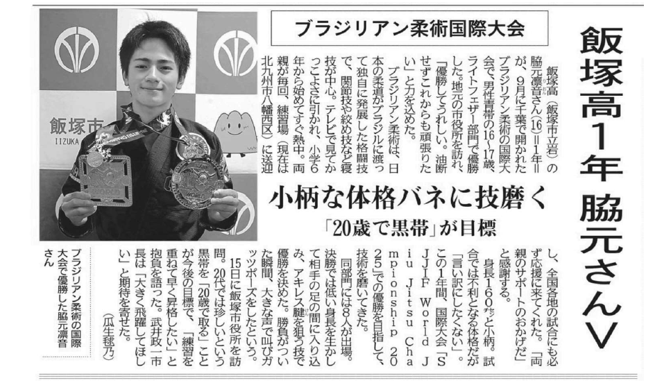 ◎ブラジリアン柔術国際大会で飯塚高校生徒が一位との事!柔術の国際大会で、飯塚高校の生徒が一位になったそうです10月30日付の 西日本新聞筑豊版からおはようございます。飯塚高校の生徒が柔術大会で活躍したそうです。『アキレス腱を狙う技』は、アキレス腱固めと思います。>私も得意技です。ご参考くださいませ。飯塚高校の柔道部には入っていないようですが、入部したら良いのにと思っております。記事に在りますが、試合に勝利をしてガッツポーズをしたり、叫んだりするのは、もし俺が審判なら、勝利取り消しと処分を出します。剣道の一本取り消しと同じです>>>個人的には、私は飯塚高校が嫌いです。大嫌いなんですよ。ここの高校の生徒らはとぼけあがった馬鹿が多いですねこの選手は、そうなって欲しくないですね末次通訳事務所・格技事業部:末次賢治拝OCT 30 2025
