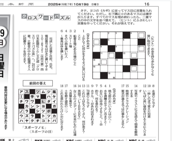 昨日10/19西日本新聞クロスワードパズル問題です 10/21AMに投函したら間に合いますトライしてみては如何でしょうか??ヒントと二重枠の文字数から答えはわかりますが実際に、ワードを入れていくとやや難しいかもですね末次通訳事務所・慈善事業部 10/20 2025