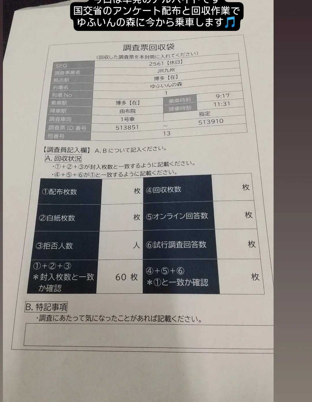 ご紹介で、JR九州での電車内(特急や新幹線)での乗客らへのアンケート依頼・配付と