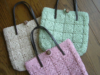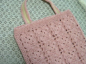 今日は仕事だと思っていたらああ勘違い。出勤して欲しいのは土曜だったんですって。それで今日はお休みになりました。『 Happy Bell 』でピンクのバッグが好評だったので追加で編み編みしました。残りの糸を見ると一つは作れるけど、もう一つはどうかな~~~って具合。という事で一つはマチを細編みにしました。これでどうにか糸は間に合いそうだけどバッグの大きさが。。。。マチがない分小さくて、携帯とハンカチくらいしか入らない。 それで大きなバッグの中に入れてもいいように、持ち手は革ではなくて編んでみました。編みながらも残りの糸とにらめっこ・・・ん~~~足りそうにない。ベージュの糸に助けてもらったらミルキーの千歳あめみたいになっちゃった。(あれって歯にくっつきやすいですよね)