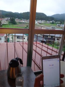 窓の外は遠目に温泉街。