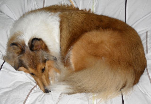 以前のレイはケラーの足元に円くなって寝るのだが、