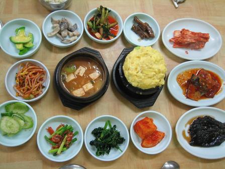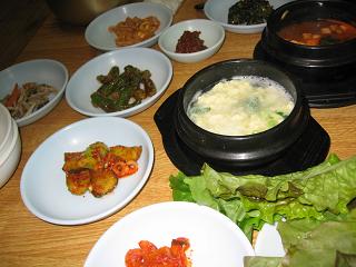 南楊州モッコル梨の産地らしい町で朝昼兼用の食事をしようと通りすがりのお店に入ってから結構時間が経って・・・お客さん多いわけじゃないのに時間かかるのね~~なんて思ってたら出来てきてズラズラ~と並べられた料理に美味しそうで自然とニヤ~ってお顔になってしまい・・・最後に真ん中にメインのお魚のお皿!そして最後に・・・実はこの食事を食べ終わった後、隠れメインはこれだと感じた“石焼のごはん”が登場して~~ソウル滞在2日目、本日最初のお食事が勢ぞろいしたのでしたまずは、数種類のおかず・・・たしか14種類あったような気がします。 定食には付いているところが多い茶碗蒸しみたいな卵の料理(あっさりめのお味でした^^)とテンジャンチゲ(すごくお味噌の味がよかったぁ)もありどれも少しづつではありましたが美味しかったです キムチはお友達が好きな味だったのか ほとんど1人で平らげてしまいました。 キムチの下はスルメのキムチ味って感じのものでイケました。 私の食べたかった“お魚さん” 同じお魚がのっているのかと思ったら、サンマさんとちょっと細身の開いたサバさんでしたここでは魚も身にして葉っぱに包んで食べるんだね~~ってコレまた発見でした この ごはん~この石の器で炊かれているのかその辺はわからないんだけど・・・とにかく目の前に出されたときは艶々でお米が光って同じ方向に向いてるみたいで美味しそうで美味しそうで・・・それに食べてもアツアツホカホカでまぁ絶品 真ん中のごはんを別の器に取りまだ熱い石の器にお茶代わりに持ってきてくれたちょっと白っぽいお米のとぎ汁を温めたような感じのおつゆを器に入れると“ジューッ”って一瞬いったと思うとなんだかいい香りがしてきてこの焦げ付いたごはんをスプーンでコキコキとってすくって食べるの~~ただのごはんがこんなに美味しいなんて~~入っていた大きな黒いお豆の存在を忘れるぐらい美味しかったよぉ~もともとごはん食いの私には感動の一品との出会いでした・・・ つづく・・・ 本日の笑顔… 90点