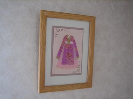 来月の韓国行きを決めました。9日夕刻便で関空~GO 楽しみ楽しみ今日は何日か前にUPしました韓紙でつくられたスタンドに続き~~私のお部屋のお気に入りちょっと韓国チックなインテリアをご紹介~ これ実は~韓国の南大門や仁寺洞なんかでおみやげ物としてよく店先で売っている1500W位のポストカード!それをこれまた安~い100円ショップでかった額に入れているだけで~~スタンド同様、寝室に飾っていますぅ結構自分でも気に入っています。この韓服の淡~い感じが大好き^^ さすがにこの韓服の色は実際はもう着れる年齢でもないしぃ~来月のソウルではまた少しゆっくりと自分の気に入る小物を探してみたいなぁ~って思っています安くて~韓国らしくて~やわらかい雰囲気のするものを・・・皆さんお店でも品物でもオススメあれば教えて下さいませ本日の笑顔… 80点
