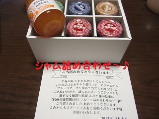 今日は3回目?4回目?のブログ更新(苦笑)夜 夕飯を食べているところにヤマトさんが来ました~当選したのは・・・スドージャム詰め合わせ(スドージャム)これと一緒かな?そういえば応募してた~!!これ、よく買うんだぁ~。安いし、美味しいし♪あ~。でももっと早く届いていれば・・・。お昼にジャム買ったばっかりぃ。。。明日の誕生日ケーキにもジャム使う予定なのでちょうど良かった♪明日、ケーキ上手に焼けるといいな♪しかし。仮面ライダーフォーゼ&メテオのケーキって本当に出来るのか…(謎)絵が難しいよぉ・・・今 すごーく研究してます・・・。