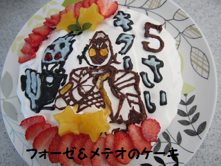 2月14日のバレンタインデーが息子5歳の誕生日ですが、14日は平日。私も夫も仕事をしているのでパーティーを今日することにしました。夕方にはバアバたちもお祝いに来てくれるというので、今日は朝から予定していた 手作りケーキを作ることに…。手作りのケーキは毎年恒例のことですが、今年は「フォーゼ&メテオのケーキがいい!!!!!」とリクエストをされた私…。う~ん。そんなプロみたいには出来んで…って思いながら悩みに悩んで… で。とりあえず喜ぶ息子の顔が見たくて母ちゃんは頑張ってみましたフォーゼ&メテオって実は我が家には本などが無いので見本が無いことに気づきました。(去年からてれびくん系の雑誌を買うのを止めました) ハテ…。どうしようか…。そこで目についたのが「コイケヤ ポリンキー」の袋。そうだ!これを見ながら絵を書けばいいのかってことでこれを片手にフリーハンドで頑張ってみました。フリーハンドなだけに…ちょっと失敗!っぽい特にメテオ 難しい~~~~~~~~~笑ってやってくださいませ…(苦笑)もうこれ以上はムリだわあ。。。悪戦苦闘した私の手作りケーキ。見た目はブチャイクだけど、愛情はこもってます。喜んでくれるといいなぁ♪