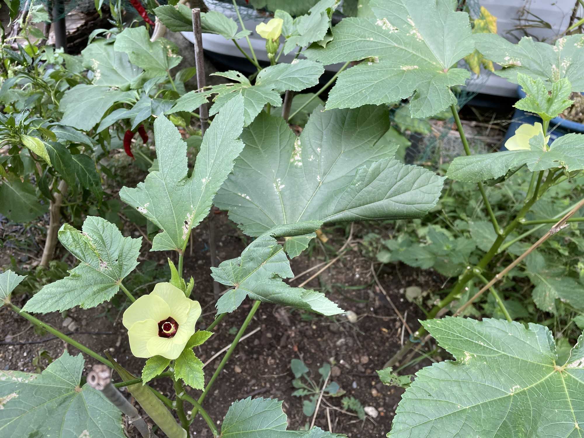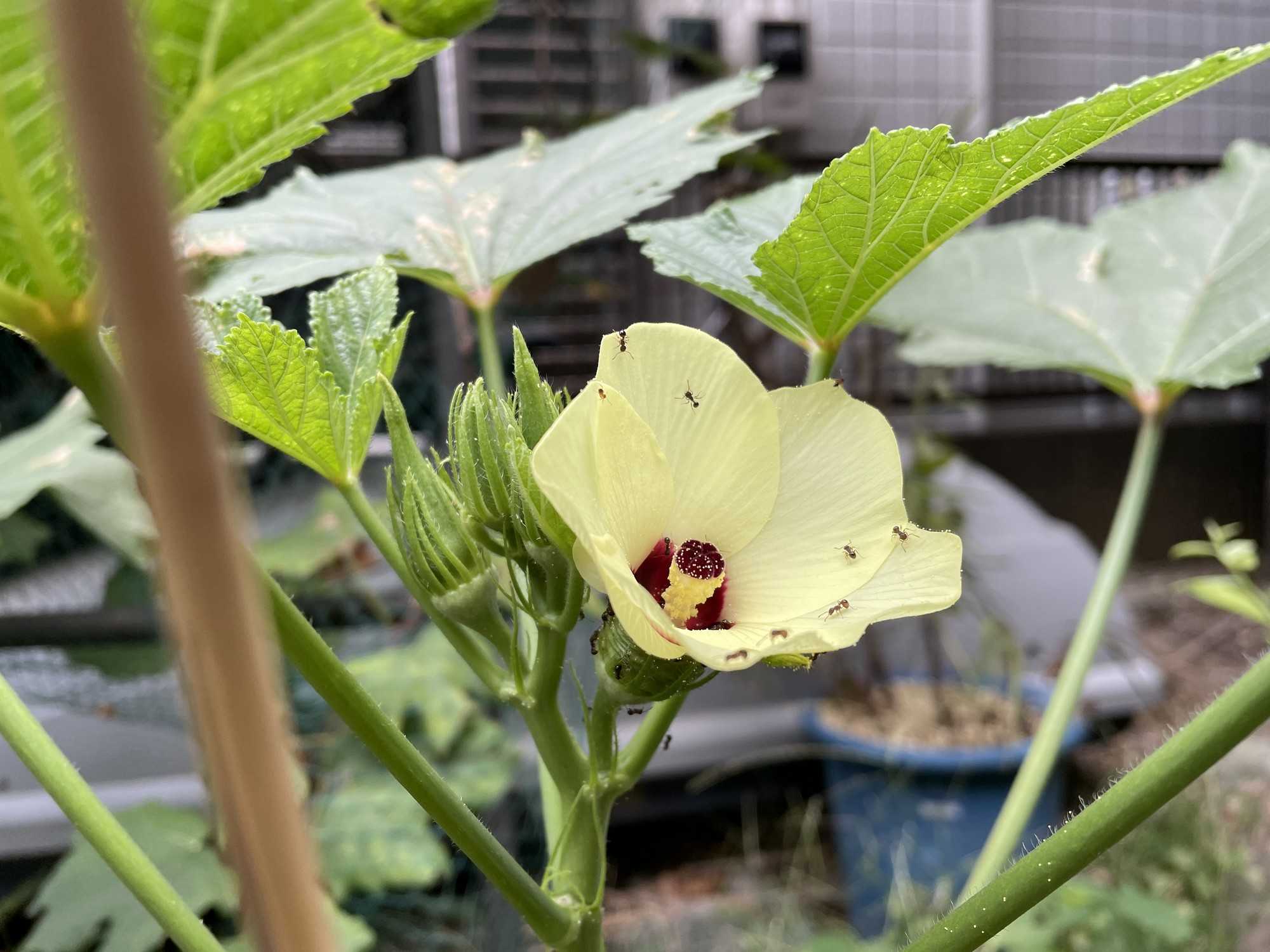 実は最近、オクラの収穫が無く、どうしたんだろうと。津尾錠の化成肥料も与えているし液肥も。水は夕方に散水しているし、まさかネコブセンチュウ?一応念のため、腐葉土に発酵鶏糞肥料を混合したものを株もとに蒔いておいたところ・・・・再び蕾が付き花が咲きだしました。化成肥料は散水で飛ばされることもあるでしょうけど、それにしても肥料食いです。ちなみに、人工授粉せずともアリたちが受粉してくれていました。にほんブログ村