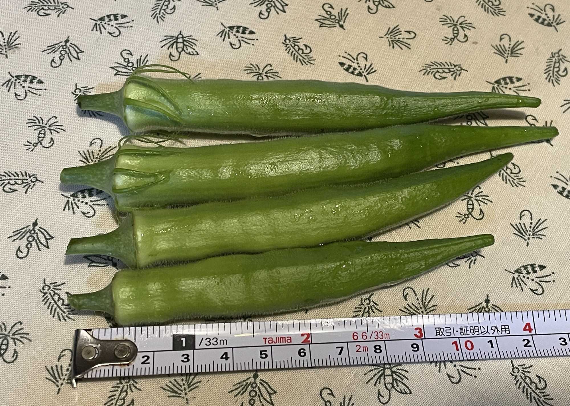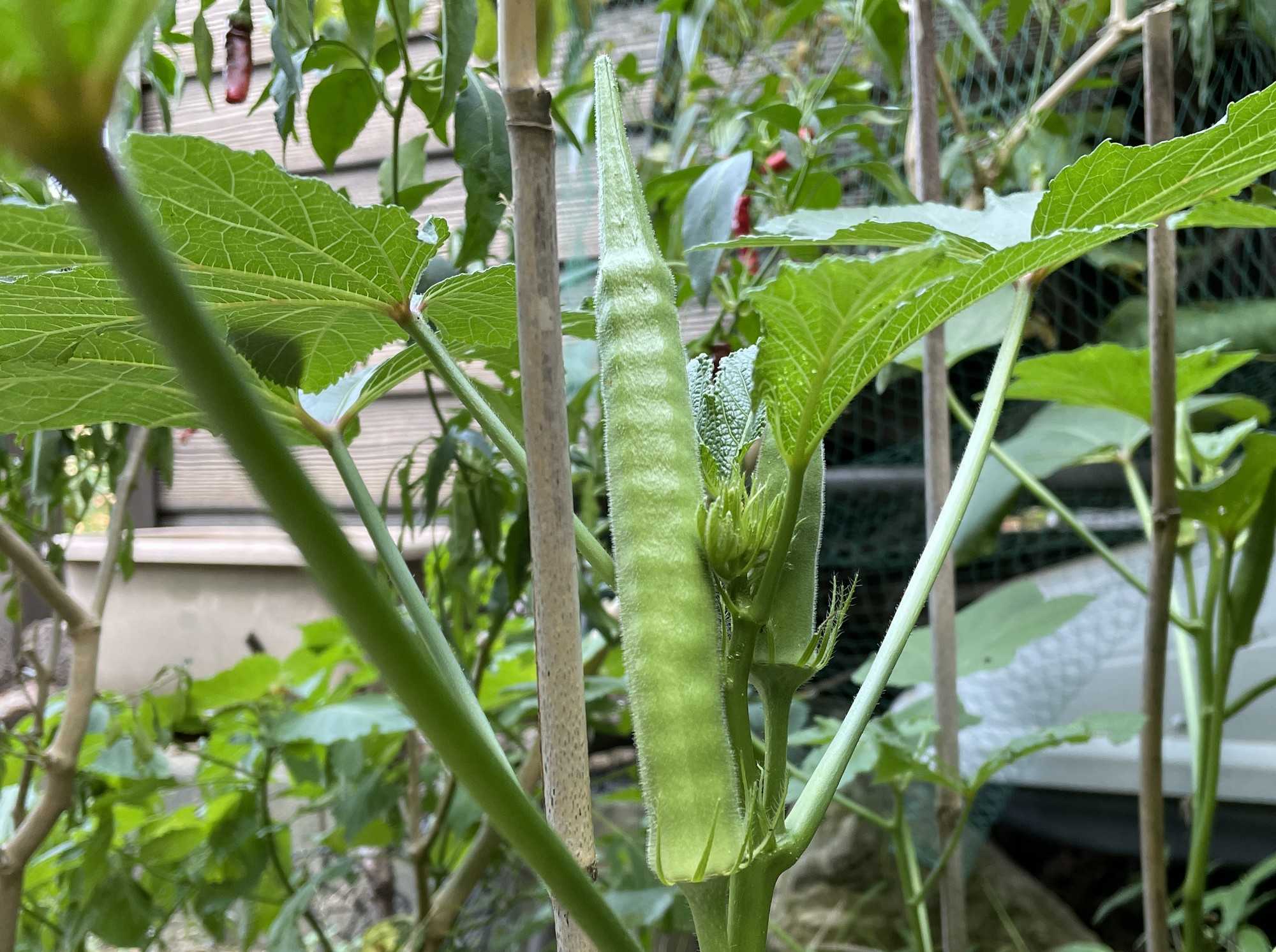 自家採種している場合、割と多いのがシーズンの最後あたりに盾と利用のものを残すタイプだと思います。以前は僕もそうだったのですが、充実した種になるのかひやひやしたりということもあり、早めに種を取るようになりました。オクラの成長に一番適したシーズンに勢いのある株から大きめの実を残します。種が熟すまで株に負担はかかりますが1個の実で大量に種が取れますし、いい状態のものばかりですから。というわけで、写真のものを採種用に残します。いくらマルオクラといえども、ここまで成長すると筋が硬くなりますしね。ほかの株もどんどんオクラがなってきています。一遍で4個くらい収穫するか、毎日一本ずつにするか、悩むシーズンになりました。にほんブログ村