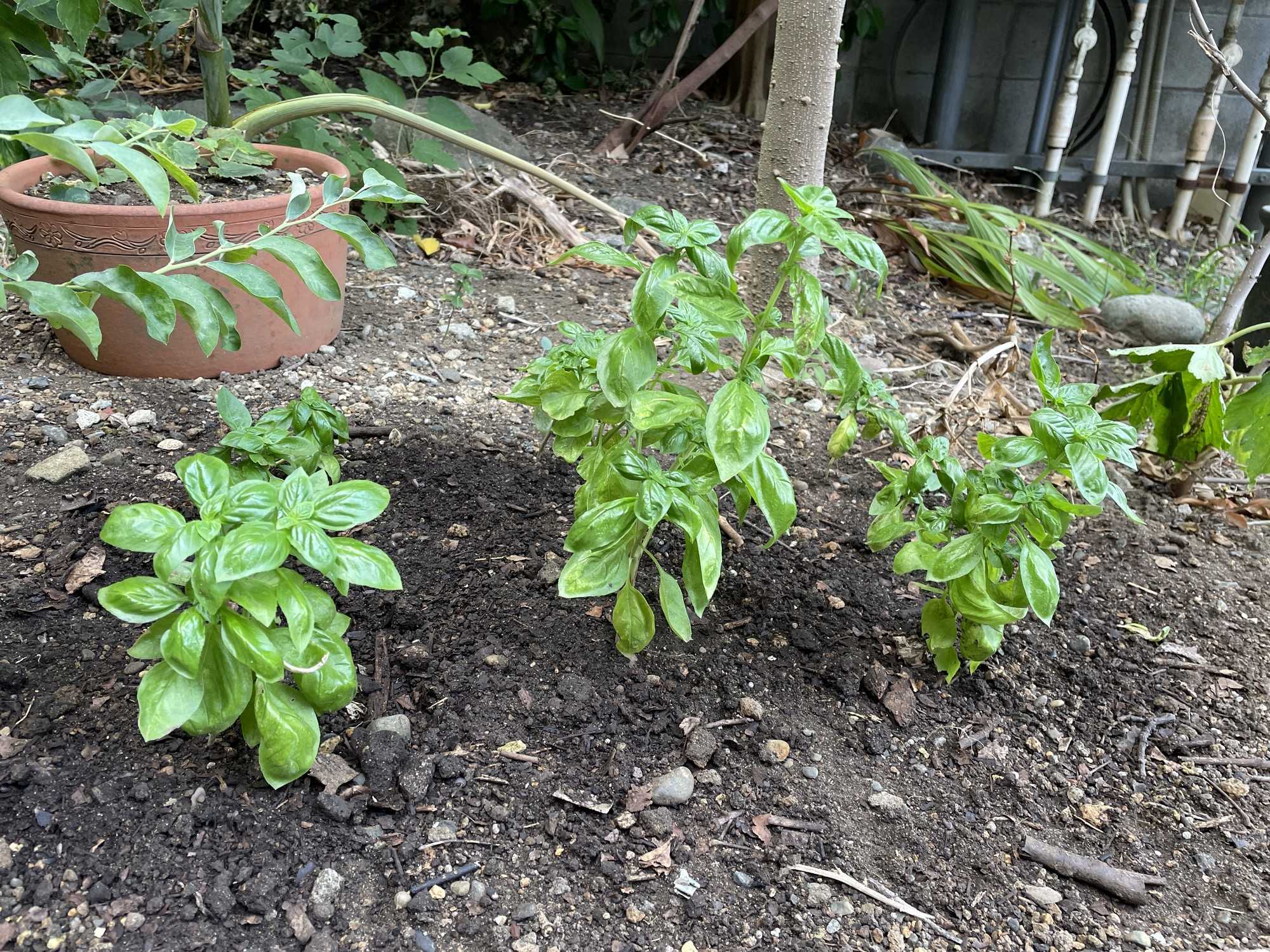 我が家のスィートバジルです。m夏を過ぎたというのにまだまだ小さいです。一株だけは頑張ってくれていますが、全体的には低調です。なぜ??実は、春まではシュンギクが植えてあり、採種まで済ませてからバジルに移ったのですが、これが幼虫でした。シュンギクの時にはものすごい勢いで茂っていたのでその後の肥料目普通に与えてから切り替えたのですが、実はシュンギク、ものすごく肥料を食うようです。シュンギクの後にはぺんぺん草も生えない・・・そんな雰囲気さえあります。秋には再びシュンギクを始めますから、そのあたりを考えて場所や土作りをしないとだめですね。そして何よりもその後のこと。にほんブログ村