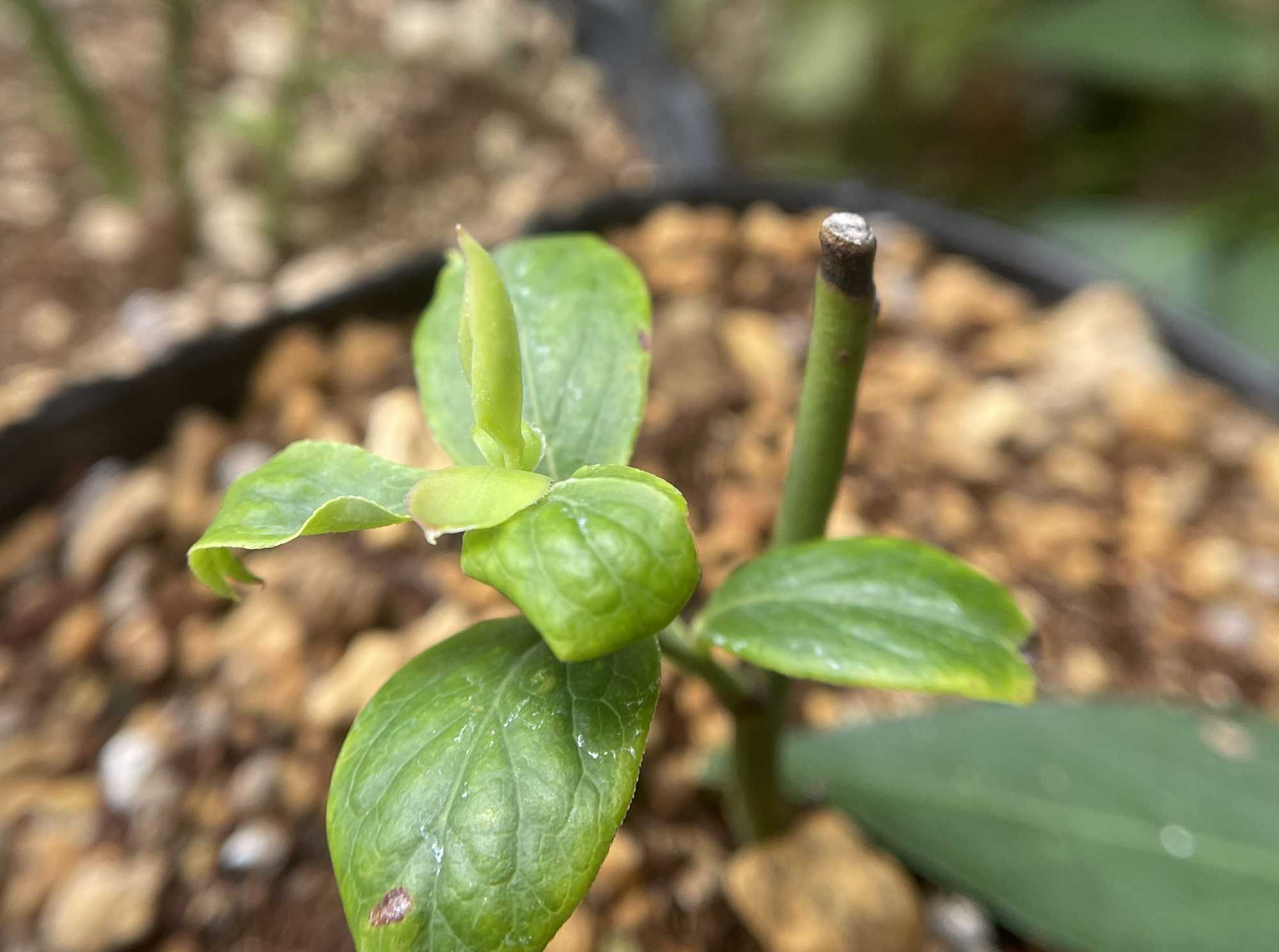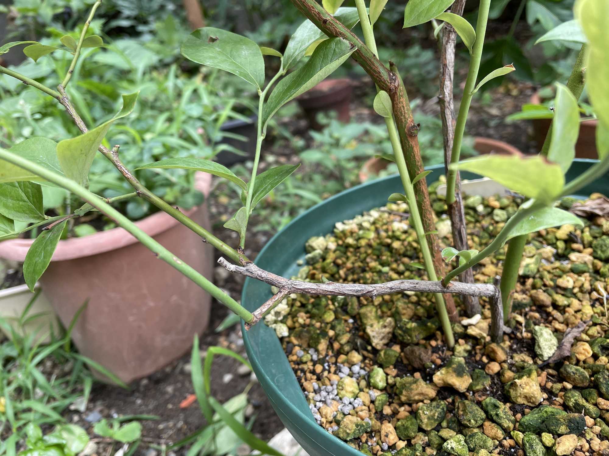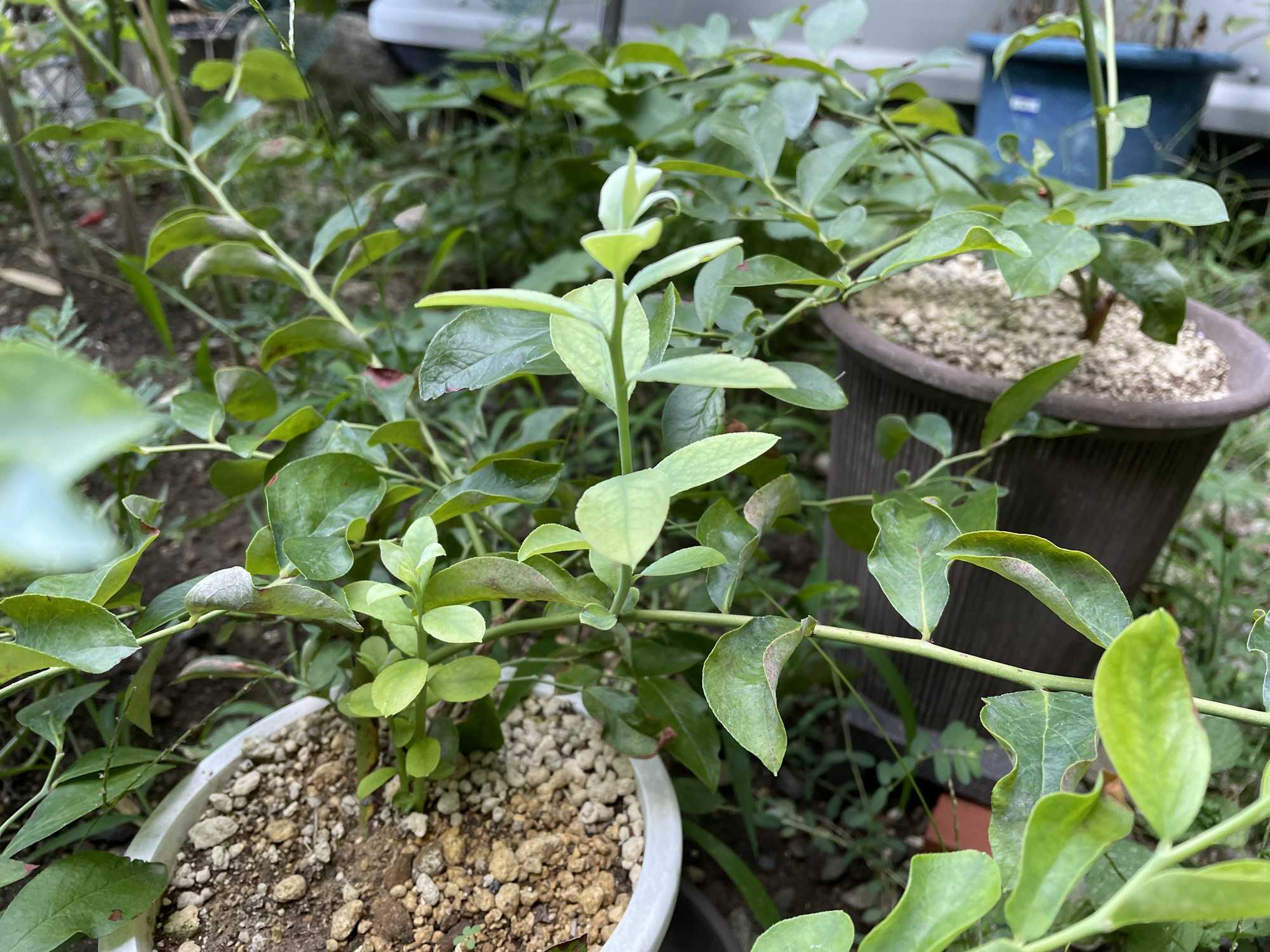 受粉用に必要だったブルーベリー(ホームベル)。すでに春には手を打ち始めていました。剪定した枝から2本だけ休眠刺しをしておいたもののうち1本が根付きました。ブラックティップが出てからずいぶん経ちましたが変化がなかったので鉢替えを兼ねてチェックすると、しっかり根が底のほうにも回っていました。それから数日で新芽が出てきました。これで安泰です。こちらは初夏に短い枝を選定した時に、もったいないので適当に挿した緑枝挿しです。全然期待もしていなかったのですが、枝が枯れることなく頑張ってるなぁと思ったら・・・新芽が伸びだしました。まだ安心はできませんが、ここまでくるとかなりの確率で根付きます。ホームベル増殖計画は、もういいかなぁ。にほんブログ村