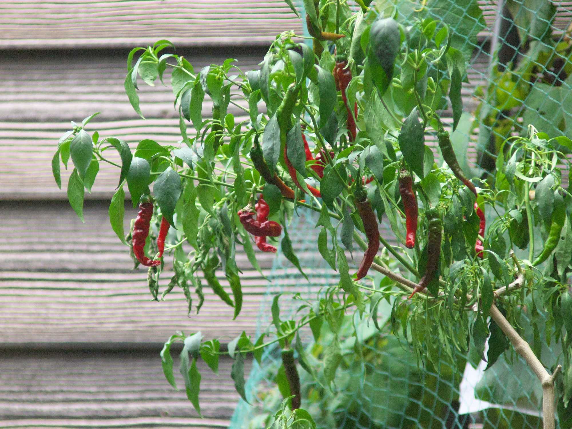 何年も年を越した激辛トウガラシの株。今年も絶好調で、どんどん実をつけています。よくある鷹の爪は実が上を向いてつきますが、このトウガラシは釣り下がるようにつきます。そしてサイズもでかい。赤くなり、熟してきたものから積んで収穫していきます。この調子でいくと、青柚子が大きくなっても青唐辛子ができていそうな感じです。にほんブログ村