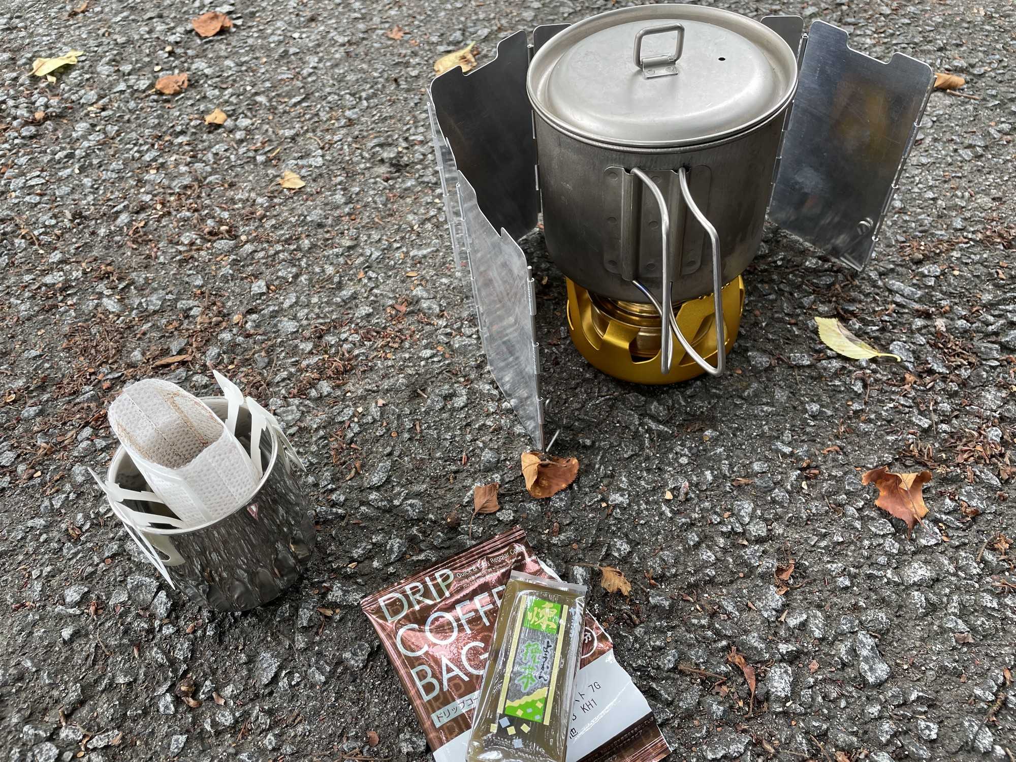 アルコールバーナーでのんびりとコーヒーを淹れます。それと、最近のお気に入りのミニ羊羹も。