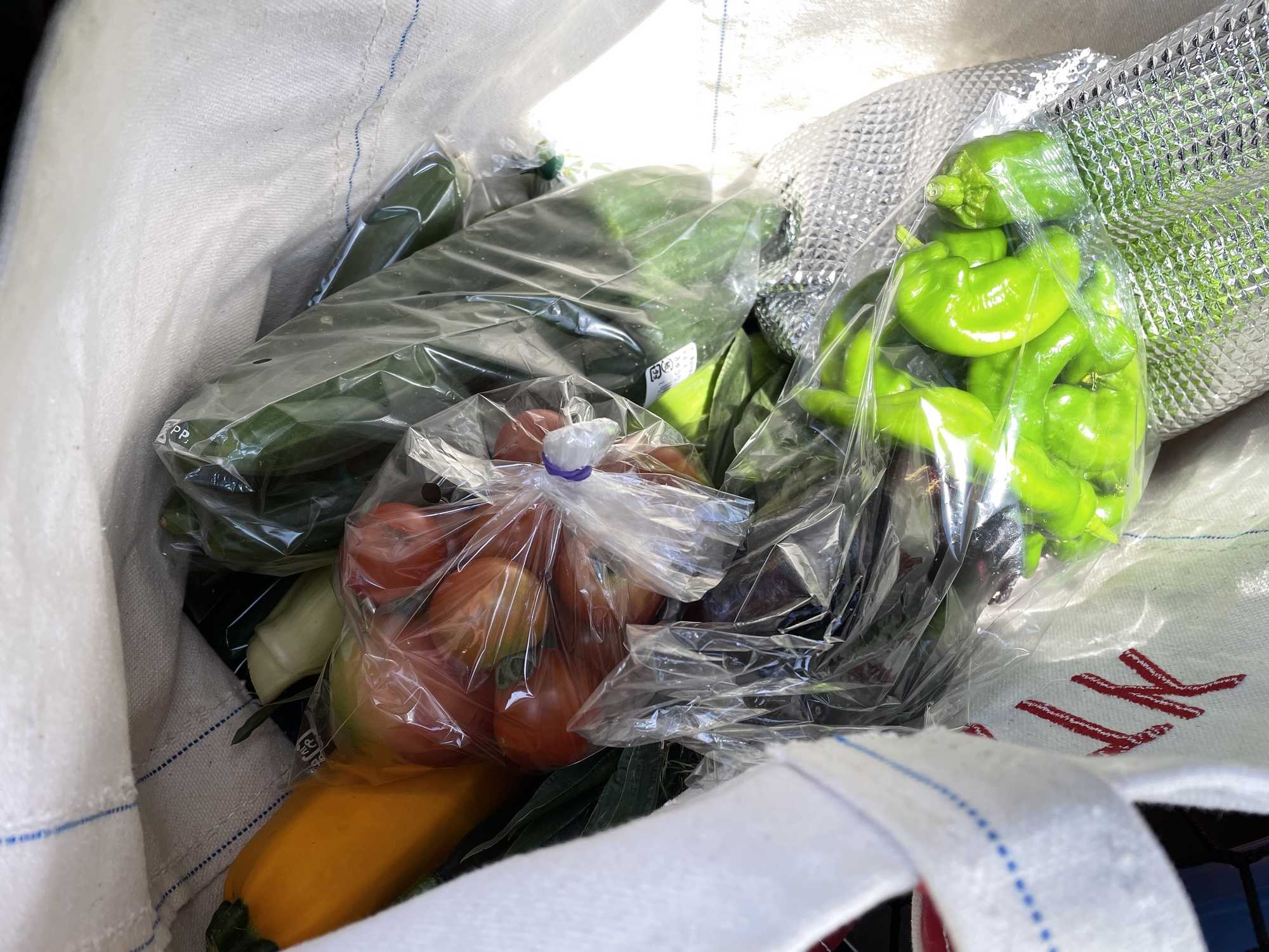 丁度、納品に来ていた生産者さんから、サイズがまちまちのトマトを買ったら、おまけでB品ナスと曲がった甘唐辛子を頂きました。曲がって居ようと美味しいものは変わりませんからね。