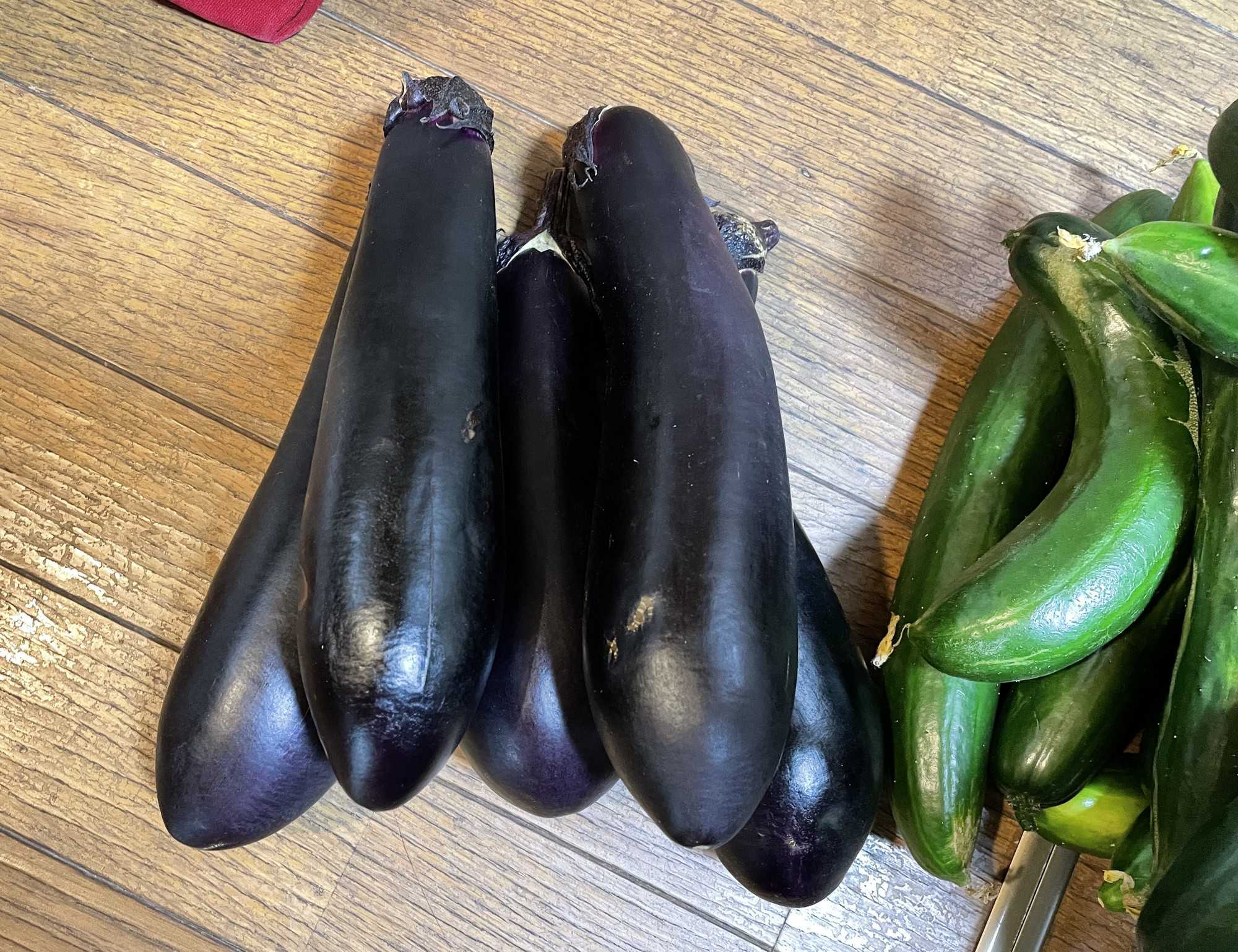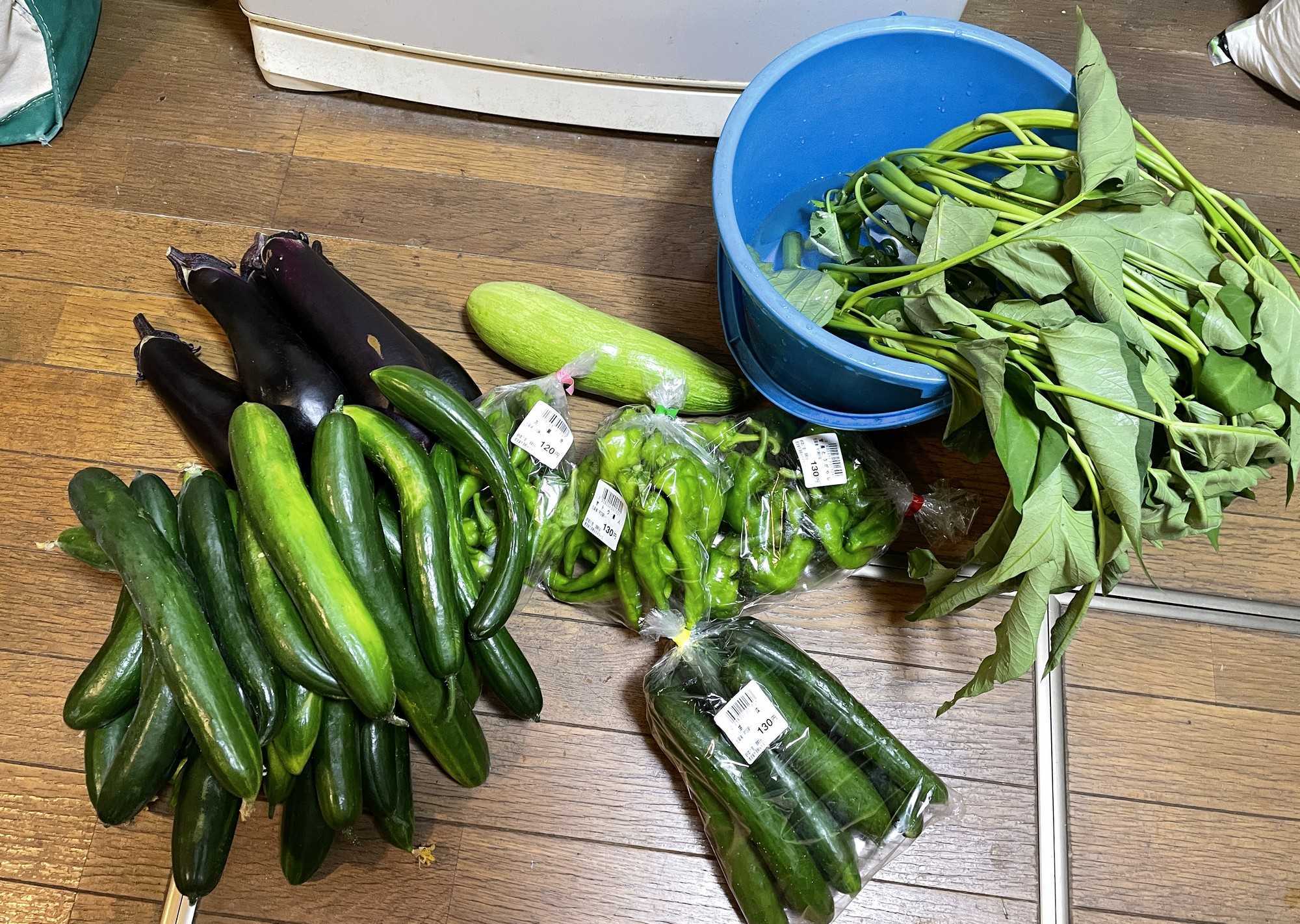 右のバケツに入っているのは空心菜ことエンサイです。甘唐辛子系3種、ズッキーニ、大量のキュウリ、巨大ナスです。