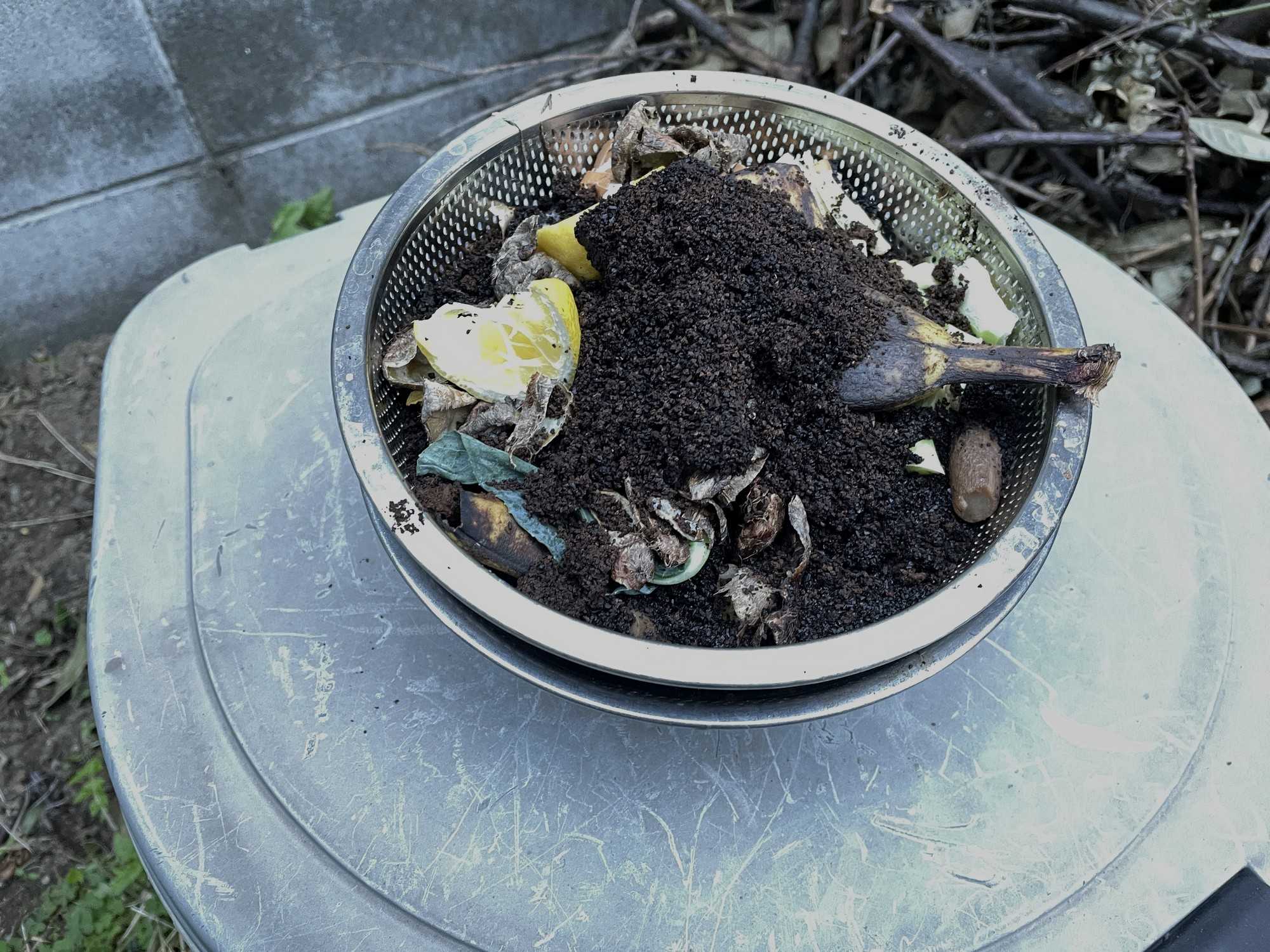 となると、生ごみが困るわけですが、我が家のパターンは毎年同じで、コンポストで分解可能なコーヒー滓、野菜くずなどはザルに分別し水を切ってからコンポストに入れています。ただ、コーヒーのフィルターペーパーなどは取り除き、絞って生ごみとして保管ですが。