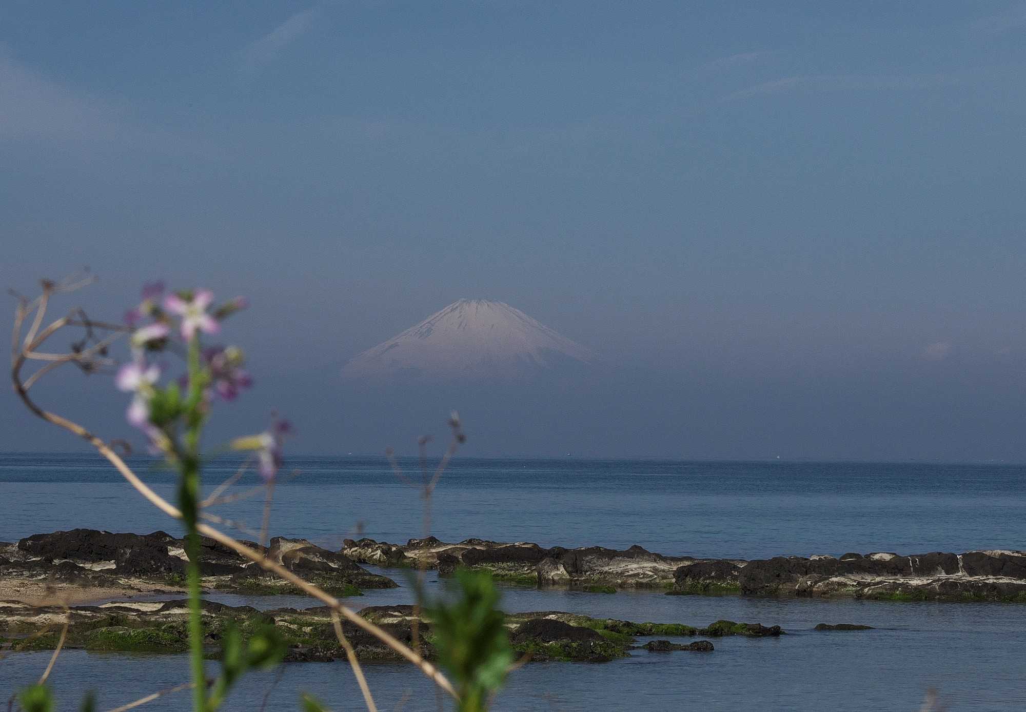 荒崎荒井の漁港からの富士山。5合目より上しか見えません。それより下は空気が濁っている雰囲気?