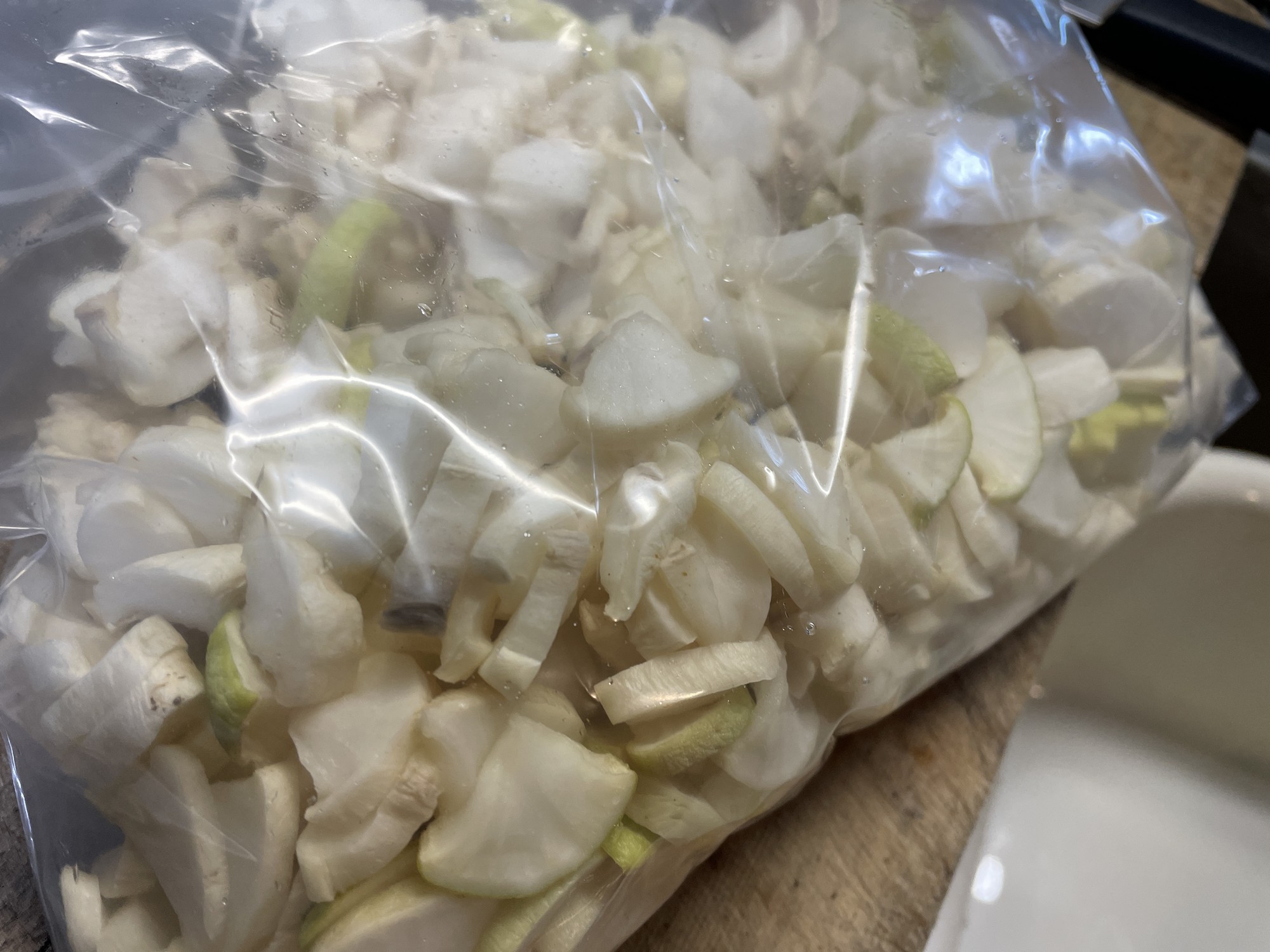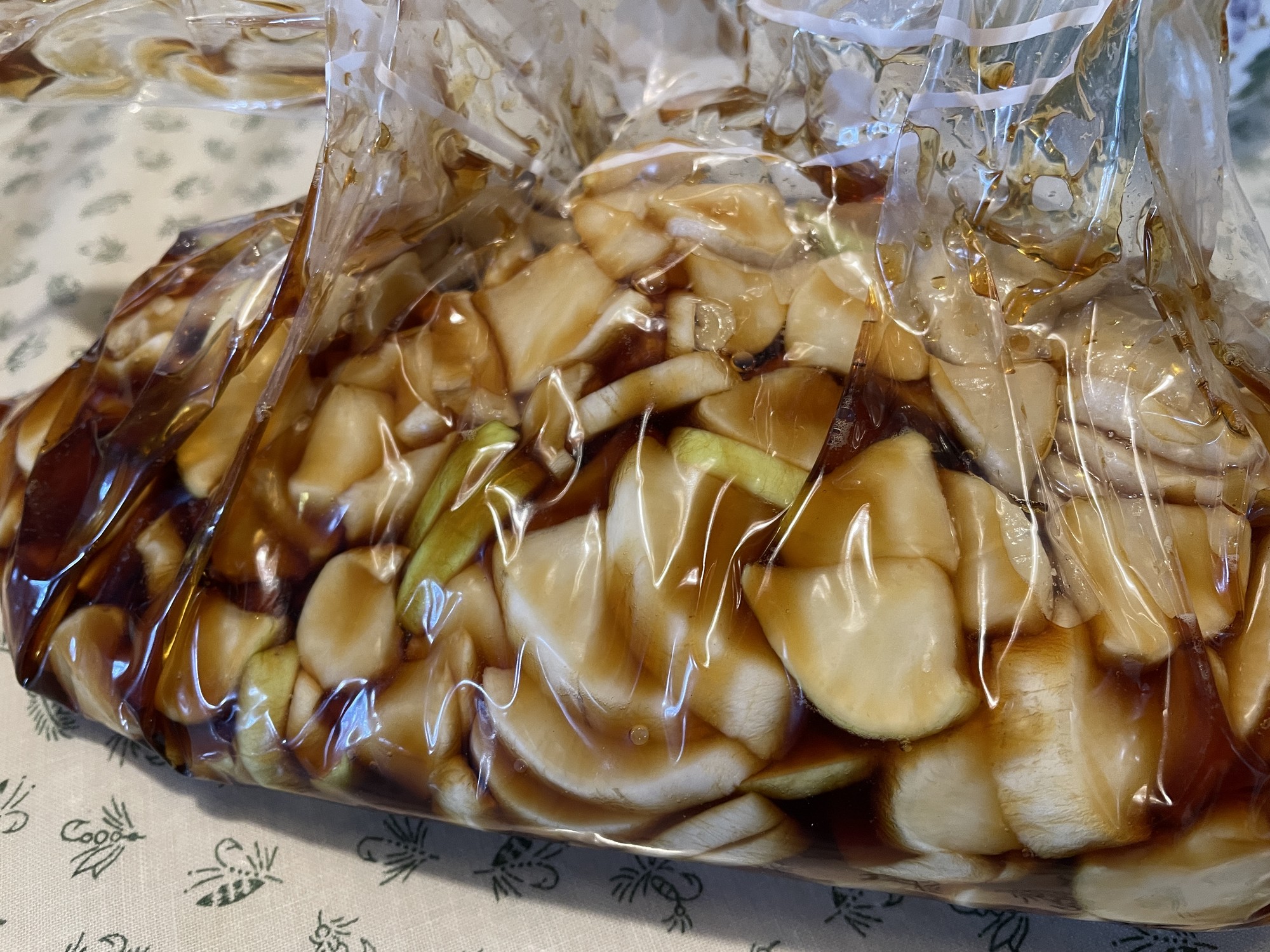 厚さ3~4mmほどにカットして、密封できる袋に入れます。この時、生姜の千切りも少々加えます。