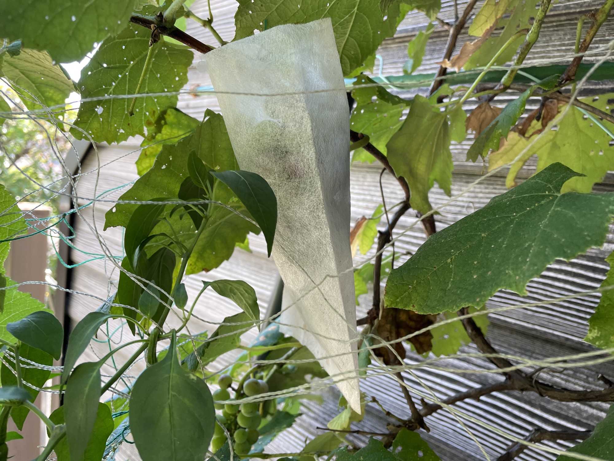 こんな感じ手製の袋を掛けました。膨張ネットもかけたほうがいいんだろうなぁ。