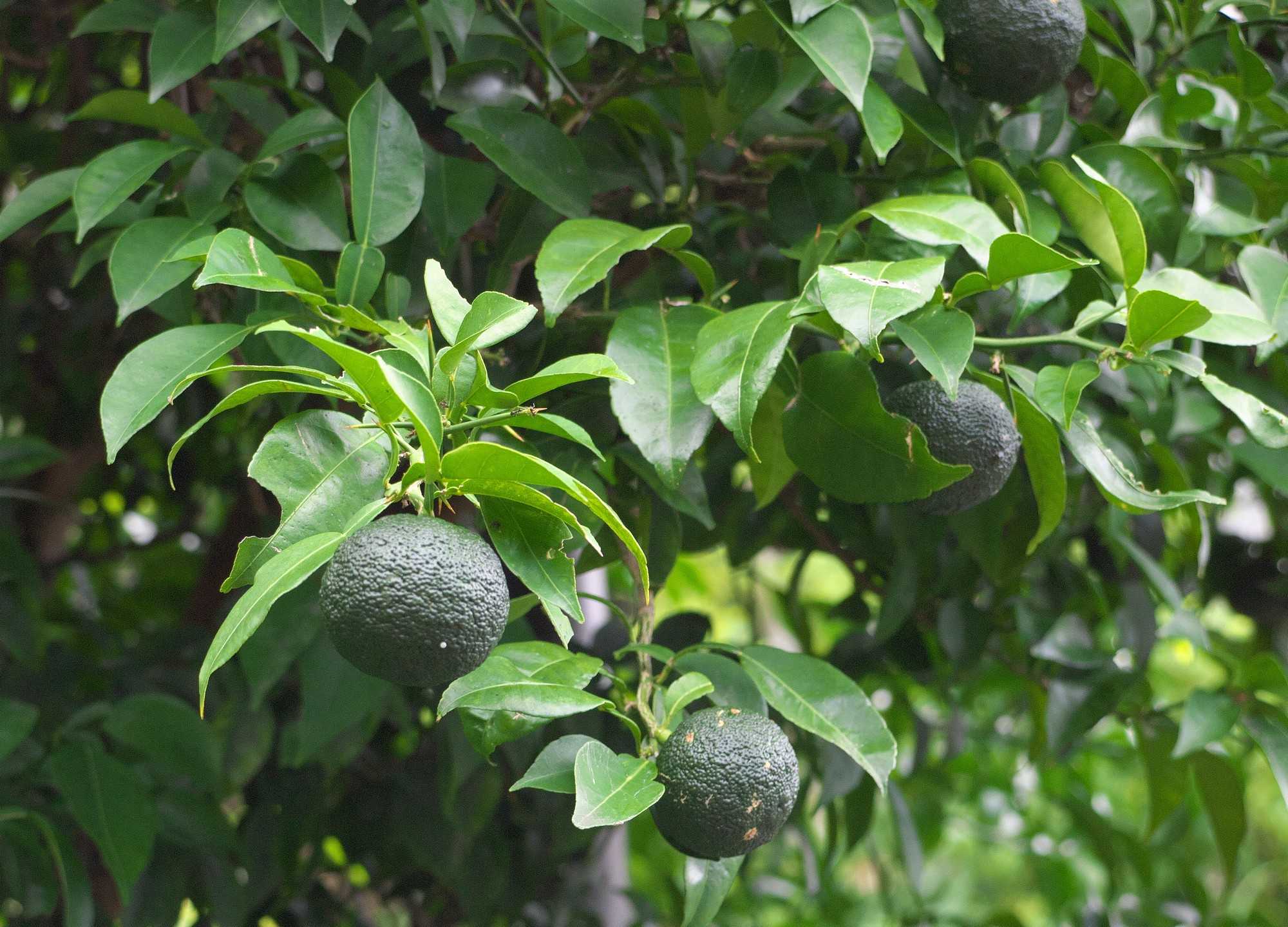現時点では青柚子はピンポン玉サイズです。まだちょっと小さいかな。荷重が十分とれなさそうですから。