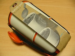 このまえもお弁当箱でしたが…またも black+blum のお弁当箱 lunch pot です。さてパッケージですが、こんな感じで使いもしない先割れスプーンがベルトに刺さってます。で、ちょっと厚めの紙帯を外して、容器を一体化しているベルトを外します。ベルトはこんな感じで、下の小さいワッカからベルトが出ていて、上の大きいワッカで二つの容器を押さえます。つまり、大きい容器と小さい容器の間には滑り止め程度のへこみはありますが、一体化する機構はありません。ちなみにこの画像は、上のワッカと透明な蓋が一緒になってますが、実際は外れます。簡単にベルトが外れるとは思いませんが、過信は禁物です。# まぁ内容物がもれるような構造ではありませんが。分解するとこんな感じ。大きな容器(550ml)と小さな容器(300ml)です。写ってませんが、大きい容器の内側にはうっすらと目盛りのエンボスがあります。で、左下が小さい容器の蓋。で、ご飯を食べ終わったら、この様に小さい容器を大きな容器に入れて、ちょっとコンパクトにできます。透明の大きい蓋も、不透明の小さい蓋にもオレンジのゴムパッキンがついてます。で、大きい容器も小さい容器も内側に三箇所ポッチがでてます。パッキンとこのポッチで蓋をがっちり止めるようになっています。なので、今の所液漏れはありません。# 振り回したりしてないからなぁ。また、容器はマイクロウェーブセーフって事で、120sec まで大丈夫だそうです。電子レンジのワット数を見つけてないので…とりあえず 90sec ぐらいまでしか試してませんけど。という事で、box appetit が普通のお弁当って感じで、この lunch pot はスープ系やどんぶり系のお弁当に使うことになるでしょう。というか、スープばっかりで、どんぶりでこちらを使った事はマダないですね…で、難点というほどではないですが…大きい方の容器は 550ml と大容量なのはよいのですが、そのおかげでちょっと深い。付属のスプーンなら良いでしょうか、お弁当用とかのフォーク・ナイフではちょっとつらいかも。ランチポット (black+blum)価格:2,940円(税込、送料別)