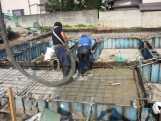 基礎工事の続き今日は、土間上段と立上の基礎の一部のコンクリートを打ちました。現場管理をしているだけで顔と腕が日に焼けて真っ黒です。熱中症になりそうです。