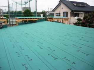 屋根の下地工事が完了して今週から屋根の仕上工事が始まりました。アスファルトルーフィング23kgと言う防水紙を施工して、その上にガルバリューム鋼板の金属屋根を施工します。この建物は玄関の屋根がFRP防水の陸屋根になっています。横殴りの雨はまだ駄目だけど雨の心配が少しなくなりました。