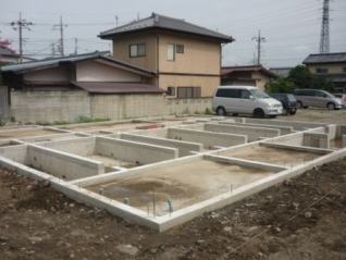 基礎が完成しました。基礎幅150mm、コンクリート強度Fc=24N、スランプ15平屋なのでちょっと贅沢な基礎です。しかし、完成したとたん毎日雨が降っています。基礎の中は水浸しです。炎天下のコンクリートは水分の蒸発が早すぎて亀裂(クラック)が発生してしまいます。従って、十分に水を補給しながら(水撒き)ゆっくり乾燥させるのが良いのです。今回、雨がいっぱい降っていて水分はたっぷりあるのでクラックの心配が少ないのですがお施主さんからすると基礎の中がプールと言うのは気持ちが良くないでしょう。。。。。ブルーシートをかけてもその上に溜まってしまいます。従って防ぐ有効な手段はありません。困りましたね。。。。