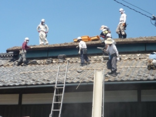 古民家の屋根の全面改修瓦屋根の葺き直し工事です。瓦の下地に土と杉皮が使用されていました。それを除去して、合板で下地を作成日本瓦を施工します。最初の一日は南片面の工事です。瓦及び下地撤去、合板下地張り、ゴムアスファルトフェルト敷き一部瓦桟施工までしました。二日目は北片面の工事をしました。今日夜雨が降りそうなので予定どうり屋根面のフェルト工事まで完了しました。これで一安心です。来週からは、本番尾の瓦工事です。