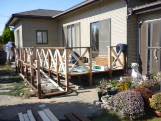 古いサンデッキの作り直しです。やはり塗装をこまめにしないとサンデッキの木が腐ってしまいます。今回、全部解体して作り直しです。見えない部分の大引や束は防腐防蟻注入済材を使用見える部分の柱や床板、手摺等はキシラデコール塗1年に一度、キシラデコールとかノンロッドとか木部浸透塗料を塗ってもらうと相当もつのですがなかなか余裕がなくて塗れないようです。手摺の笠木部分にカラー鉄板等をかぶせると非常に有効なのですが、少しカッコが悪い。。。。?もう少しで完成です。