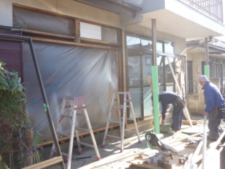 掃き出しサッシの取替えとサンルームの設置工事をしました。 古い掃き出しサッシを新しい欄間付のアルミサッシに取り替えました。 その後、サッシを取替えた面にサンルームを新設設置しました。サンルームはサッシの真ん中についています。特殊な柱と加工でアルミサッシが動くように計画してあります。壁の補修をして終了です。