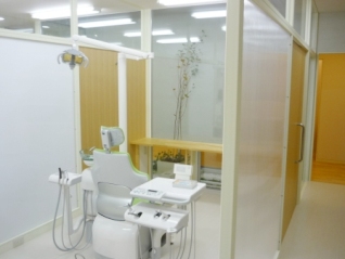 歯科医院診察台設置しました。診察台から中庭が見える設定になっています。サンデッキの上にホワイトストーンを敷詰めています。植栽はプランターに植えています。
