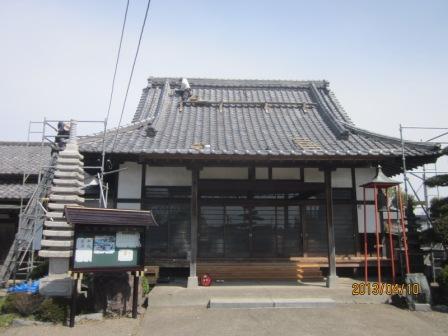 お寺の屋根瓦の補修工事です。棟の瓦の南蛮漆喰が剥がれ落ちているため棟瓦の補修工事をしています。