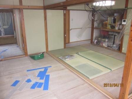和室居間の畳を撤去して床下地を改修してフローリング仕様に変更して床の高さを廊下、トイレ、脱衣洗面風呂、キッチンの床の高さと同じにしました。(バリアフリー化)畳を剥がしているところ和室の敷居も全て撤去して建具も高さ改修入口も広げて2本引込み戸に改修完成しました。