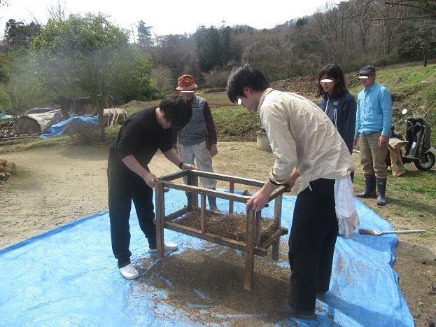 枝と殻が団子になっているので、網の目の箱で揺さぶると