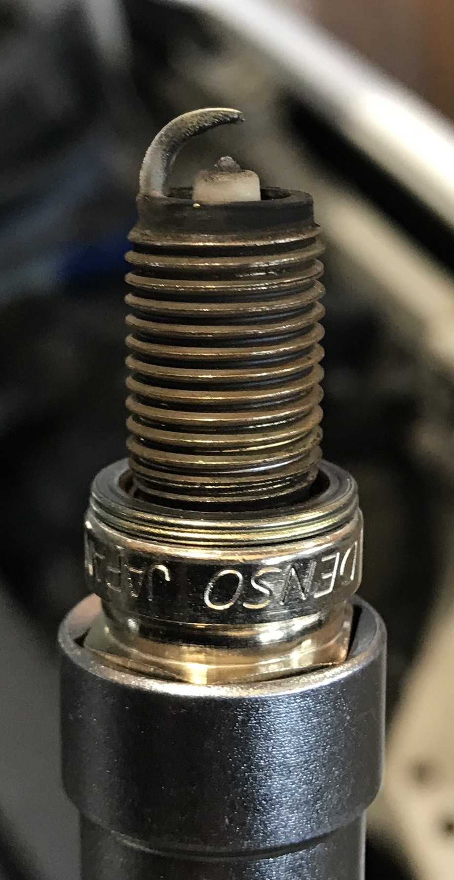点火系統は、シリンダー内で圧縮された混合気に点火して燃焼させる為に必要な火花を発生させるものです。従来のディストリビューター(エンジンの点火タイミングをつかさどる仕組みの1つ)を用いた点火装置に代わり、気筒別独立点火方式(ダイレクトイグニッション)を用いたものが主流となっている。気筒別独立点火方式は、各気筒に配置されたイグナイタ内蔵のイグニッションコイルをECUが各センサーのをもとに制御するものです。エンジンチェックランプ点灯と、アイドル不良でエラーコードでイグナイタのエラーが出たら、イグニッションコイルの不良の可能性が高いです。また、プラグにおいては、茶色に焼け、リークも無く、プラグギャップが正常であれば問題はありませんが、下のような場合は、プラグギャップがかなり広がり、リークしていて、症状として、加速が重く、吹け上がらなく、ハンチング+エンジンバタつきがありました。こんな状態ならプラグを交換しましょう(^_^;)
