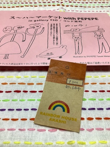 東京中の福祉事業所がつくる雑貨を一堂に集めて販売するイベント「ス〜ハ〜マーケット with PEPEPE」敬愛する落語家の小夏さんがFacebookで告知していらしたので小夏びいきの私、すわ!と仕事帰りにはせ参じましたはじめての「コレド室町3」小さなイベントスペース、ところ狭しと様々な雑貨たちこまかな文具から、大きなバッグやストールやオシャレで品の良い手作りの物もあってでも、お買い物で福祉事務所の役に立つのならこういう催しがあるとたくさんの方に知ってもらいたいと自分のための大物でなく小さいものをたくさん買って友達にわけてあげてその時に説明するのがいいかなって細かい物、たくさん買いました写真のスプーンは自分用に。このステキなデザインの一筆箋、なんと襖の見本帳を加工したもの以前、畳のヘリで作るバッグが流行ったことありましたね襖の見本もこんな風に再利用できるんですねたくさんあるけれど使い道なくて、と寄付してくださる方がいらして就労支援事務所の方が封筒に作って下さり、私のようなブキッチョさんはありがたく求め、私から受け取った人たちは美しく丈夫な封筒にお手紙やお月謝いれて、趣味がいいねって褒められて…どんどんつながって笑顔がふえるみんなウレシイっていいなぁ、小夏さん、教えてくれてどうもありがとう!次回もまた、お知らせくださいね日時:2021年8月25日水曜日~31日火曜日 11時-20時(土日-19時)場所:コレド室町3(東京都中央区日本橋室町1-5-5)内容:東京都内福祉事業所の雑貨販売参加事業所:ヴィ長屋 フロムヴィ 大橋えのき園 オーク みつばちブンブン アトリエゆうかり 清瀬聖ヨハネ支援センター レインボー明石 綾瀬福祉園 玉川福祉作業所 工房アミ希望の郷 クラフト工房 ラ・まの 日の出太陽の家大田幸陽会のぞみ園 二アース! 蓮根福祉園小茂根福祉園 前野福祉園 愛輪の里 雅