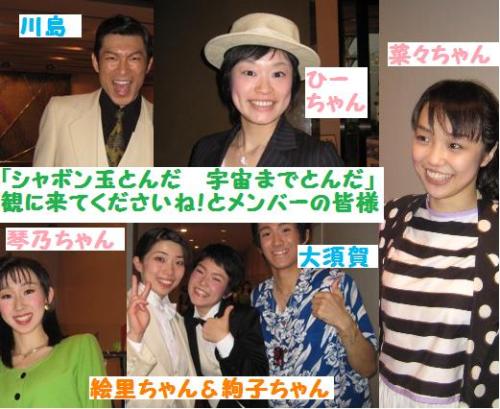 たとえば流れ星 見つからなくてもいつの日か 夢は叶う輝く心あればついつい、「ドリーム」の歌詞が浮かんで仕事中にも歌いそうになって、何度もヒヤッ!夢が叶います、その大事な日がついに来ます。今から、ウキウキしているのは、同じ日に、親しい友達が観るってメールが集まってきてそれだけでも嬉しいのに、カニちゃんが可愛がっているお嬢さん達以前、「シャボン玉」を観て感激し、(菜々ちゃんが初めてお佳代を演じた年の)家に帰ってからもずっと、ドリームを歌っていた幼い姉妹とも、一緒に観られることになったのです。大好きな作品を、大好きなみんなと観られるのは最高にシアワセです。写真は前回のロビー面会にて。写真の中で男性には敬称がなくて、ゴメンナサイ。どうしたことか、手違い。元の写真を探せたらちゃんと敬称、つけますからね。m(__)m