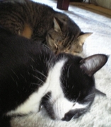 コタツにいるバァを立ち上がらせる。「お、重~い」「イヒヒ」バァが笑う。つられて笑って腰が抜けそうになる。「どのくらいあるかいの? 10貫くらいか」ちょうど昨日、バァがウチに来る前の、入院中の写真を久々に見てビックリしたとこ。すごく痩せてるそう、その姿を見て、このままにしておけないと思ったんだ2ヶ月の入院で少しふっくらしたものの、ウチに来たときは35キロだったよ、とダーリン。それ以来初めての計測。1貫3.75キロだから9貫ちょっとだった体重が11貫弱になってたついでにネコ1号は1貫足らず。ネコ2号は1.5貫。ほぼネコ2号分の増加。手前がネコ2号。ネコ2号分太ったバァはぽっちゃりしてカワイイがこれ以上は、膝や内臓にも負担をかけるだろう。これからは体重管理にも気をつけねばふいにバァがダーリンと私の顔を交互に見比べる。「どっちがエエか」ん?何の話?頭?性格?顔?顔なら私の方がキレイだけど?「キレイなことあるか(キレイではない、の意)」えーん今日は何の加減かいつもと変わらぬ味付けなのに晩御飯を食べながらバァは「辛~い」を連発。箸でつまんだだけで「辛~い」そんなわけないだろ~。「バァ、名前を辛いちゃんに変えたら?」「イヒヒ」「辛いちゃ~ん」「は~い」ノリはよし食後、口にお茶をふくんだままクシャミ。テーブルの端から端までお茶が飛ぶ勢いもよし